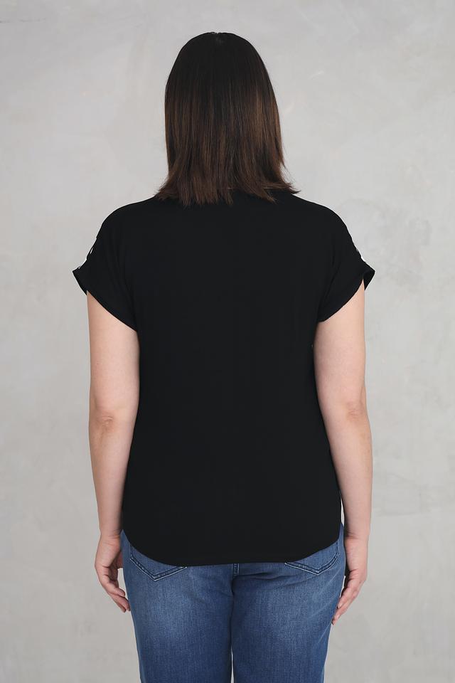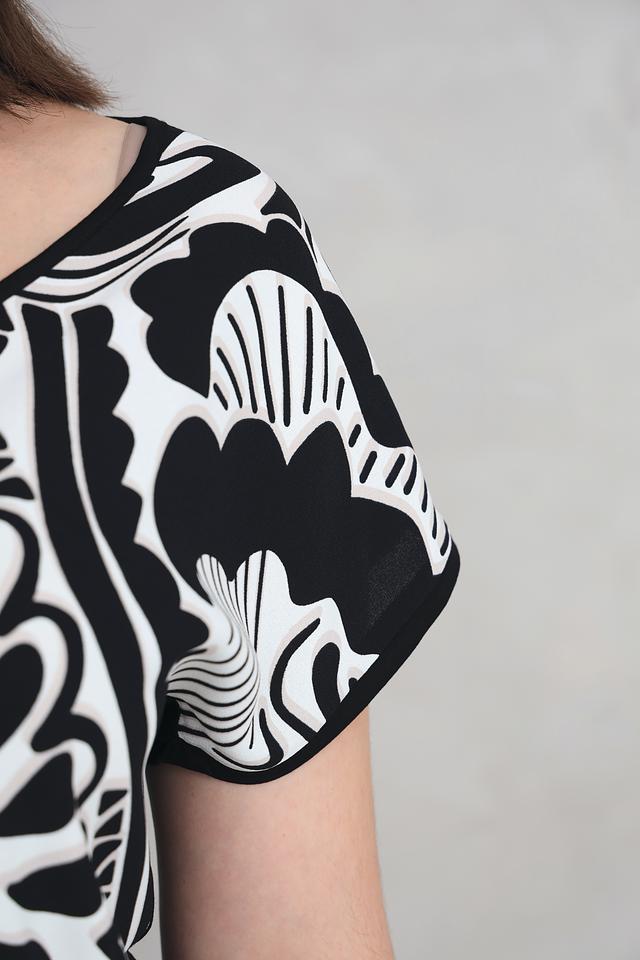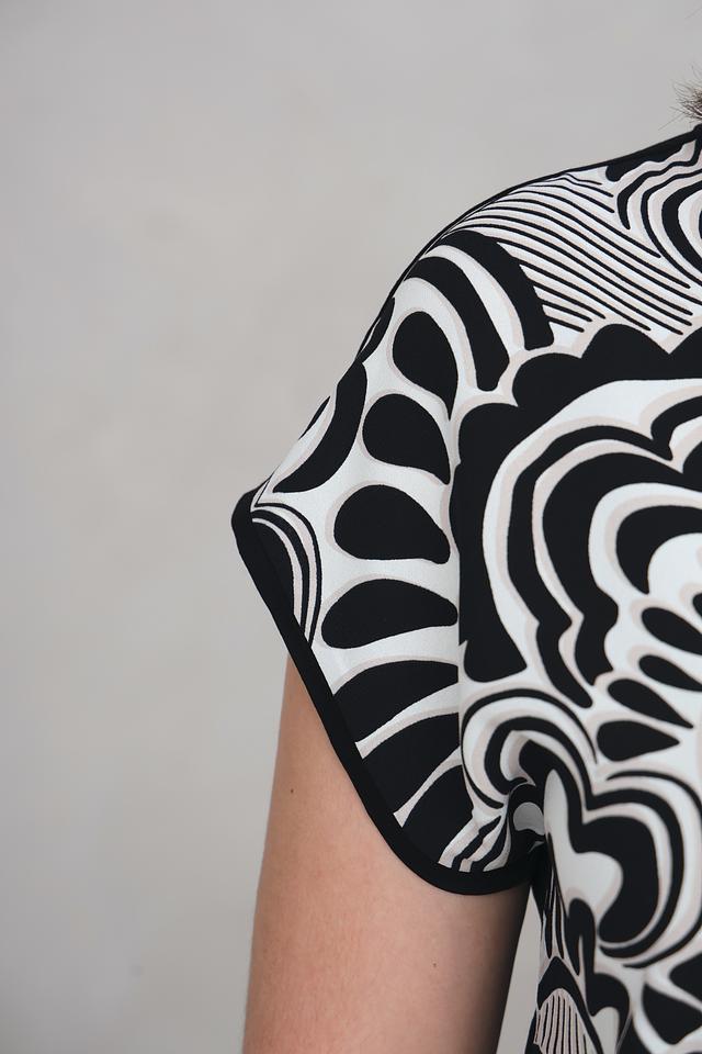 Блуза Via Appia чёрно-белого цвета с оригинальным абстрактным принтом. Модель с V-образным вырезом и короткими рукавами, выполненная из мягкой и приятной к телу вискозы с добавлением эластана. Состав: вискоза 94%, эластан 6%