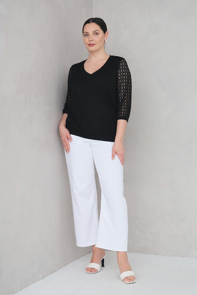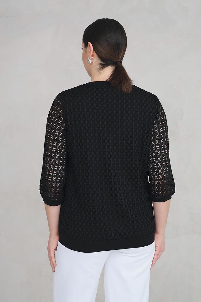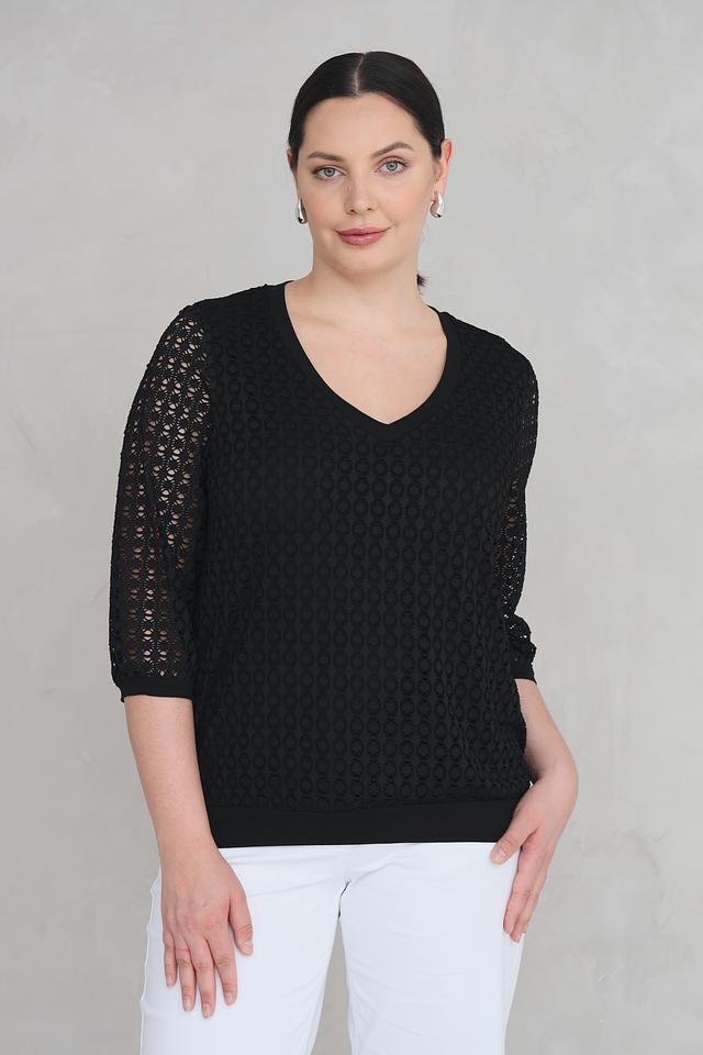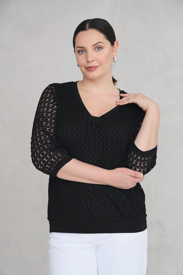 Чёрная блуза Via Appia с V-образным вырезом и кружевными рукавами. Модель выполнена из полиэстера с добавлением эластана, что обеспечивает комфорт и хорошую посадку по фигуре. Состав: полиэстер 95%, эластан 5%