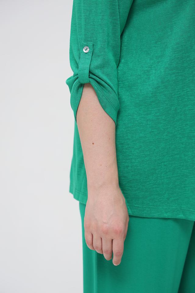 Жакет имеет рукава длиной 3/4, которые слегка присборены у манжеты, что придает образу лёгкость и непринужденность. Застежка выполнена на небольшие пуговицы в тон изделия. Спереди предусмотрены функциональные карманы.