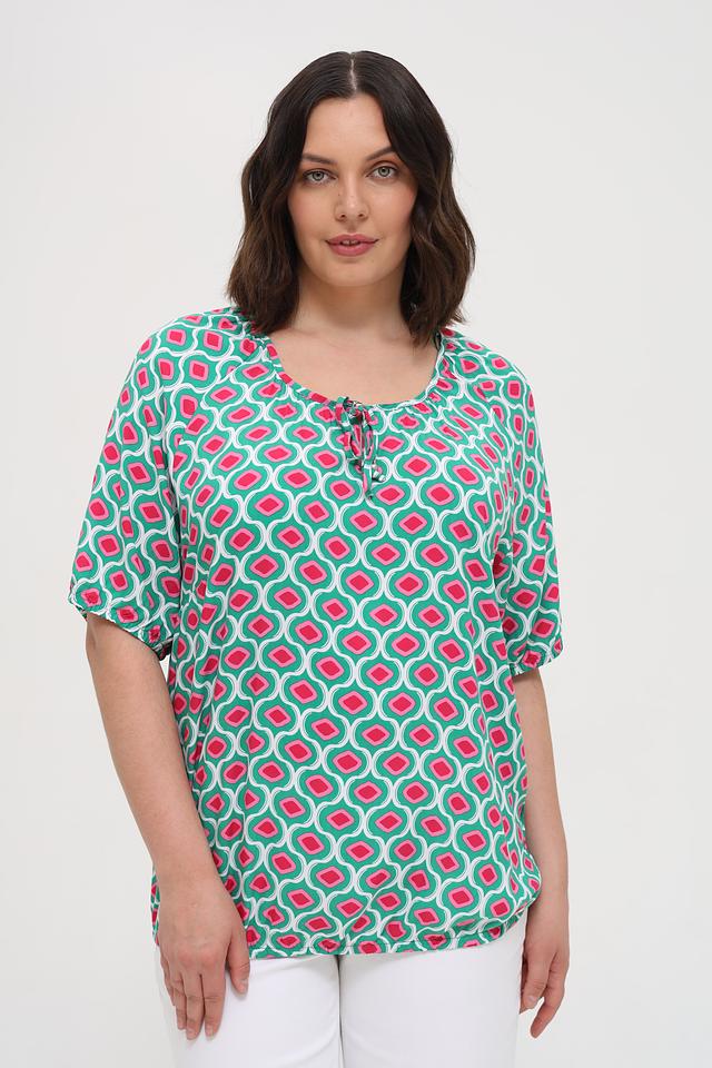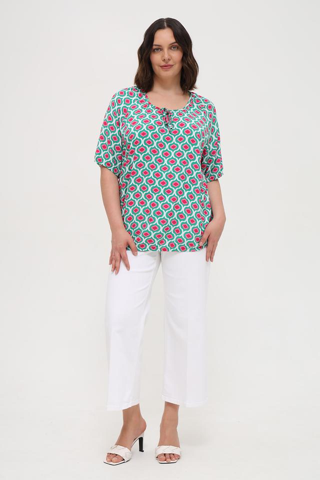 Особенностью данной модели является яркий геометрический принт, сочетающий в себе оттенки зеленого, розового и белого. Круглый вырез горловины дополнен небольшим сборкой и завязками, что придает блузе женственности и изящества. Короткие рукава делают ее идеальной для теплой погоды.
