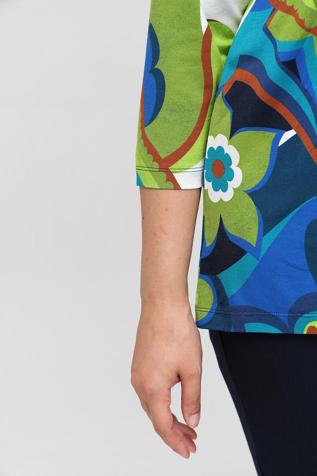 Блуза имеет свободный крой, короткий рукав 3/4 и V-образный вырез горловины. Особенность модели – эффектный цветочный принт, сочетающий в себе оттенки синего, зеленого и белого. Такой рисунок добавит образу свежести и легкости.