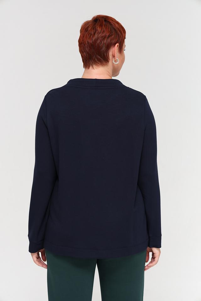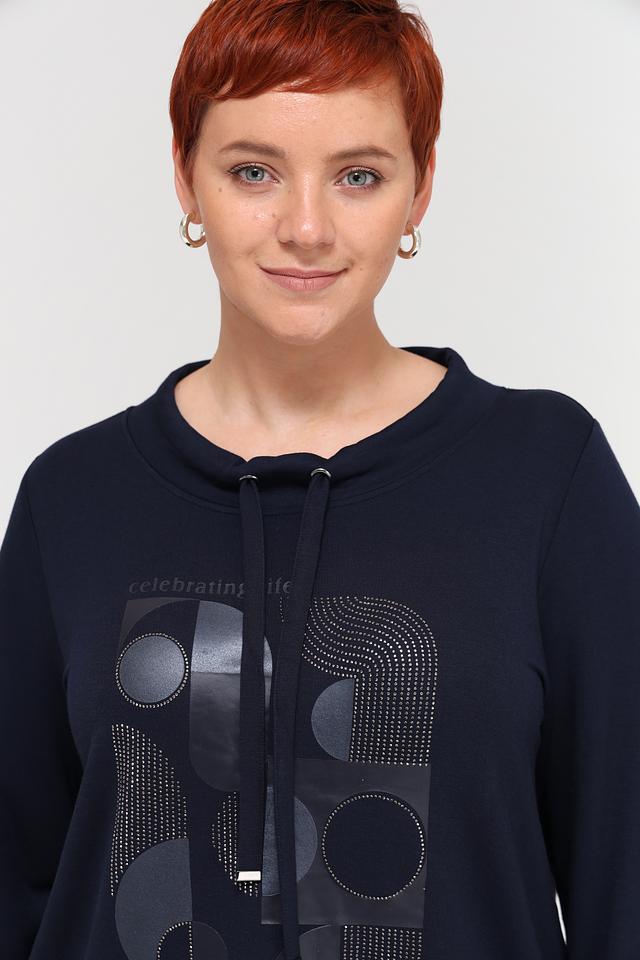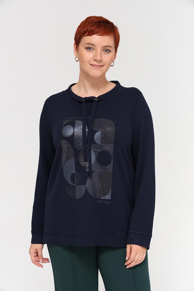 Этот пуловер от Via Appia станет отличным дополнением к вашему гардеробу. Выполненный в темно-синем цвете, он привлекает внимание необычным принтом с геометрическими фигурами и имитацией страз.