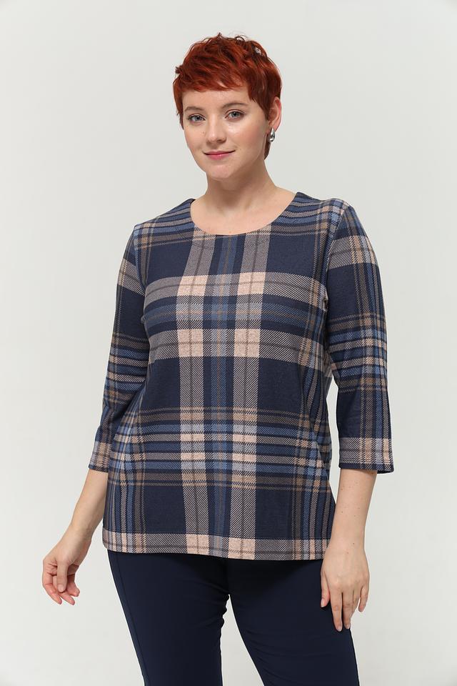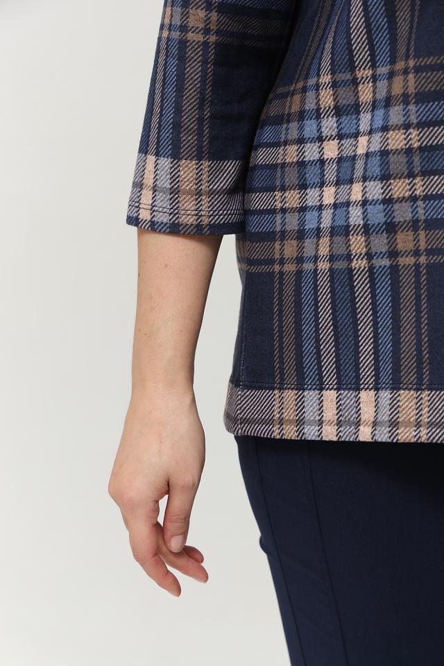 Пуловер имеет классический крой и круглый вырез горловины. Его отличает яркий клетчатый принт в синих, бежевых и коричневых тонах, который придаёт изделию особый шарм.