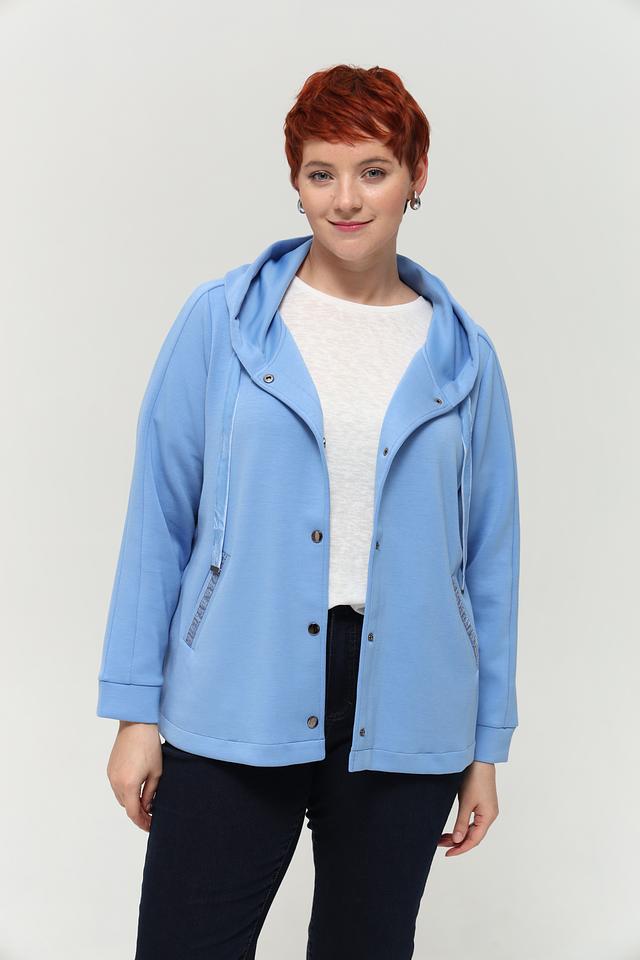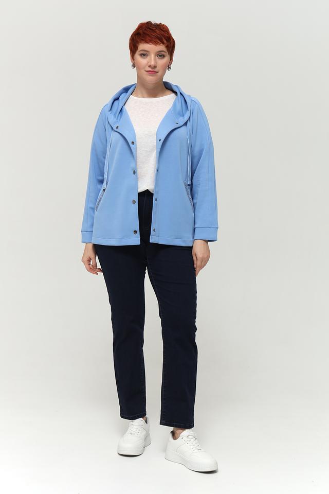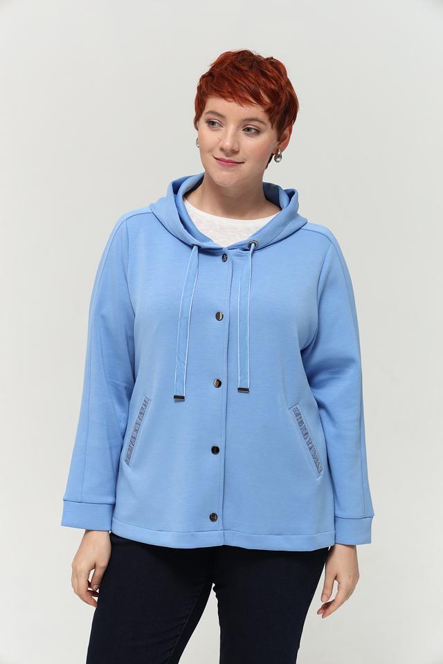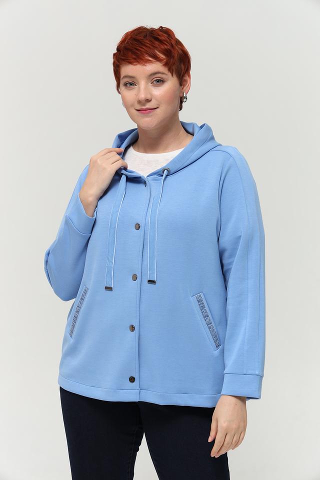 Женский жакет Via Appia голубого цвета с капюшоном и застёжкой на пуговицы. Модель выполнена из мягкой ткани с добавлением вискозы и полиэстера, что обеспечивает комфорт и удобство в носке. Состав: вискоза 49%, полиэстер 43%, эластан 8%