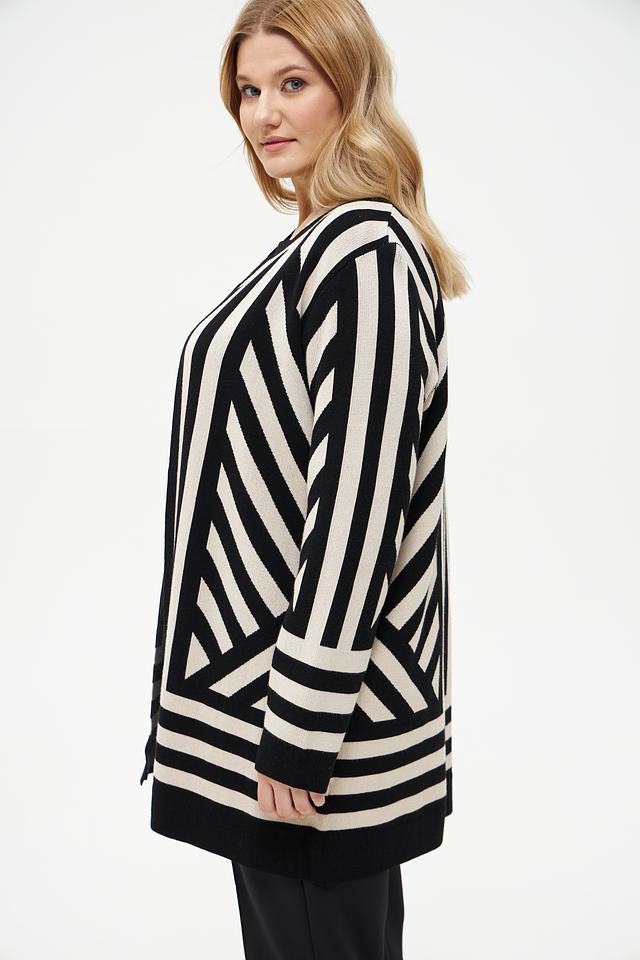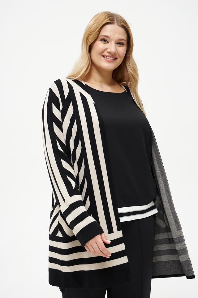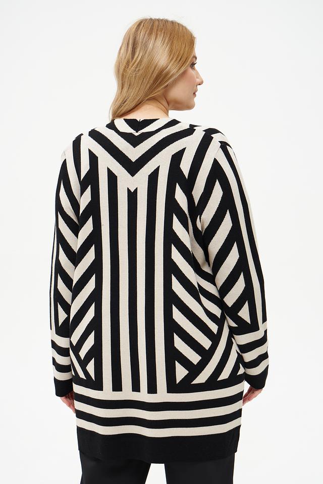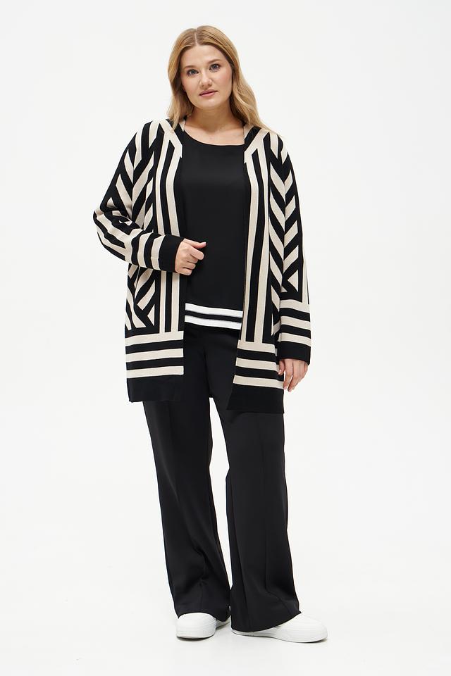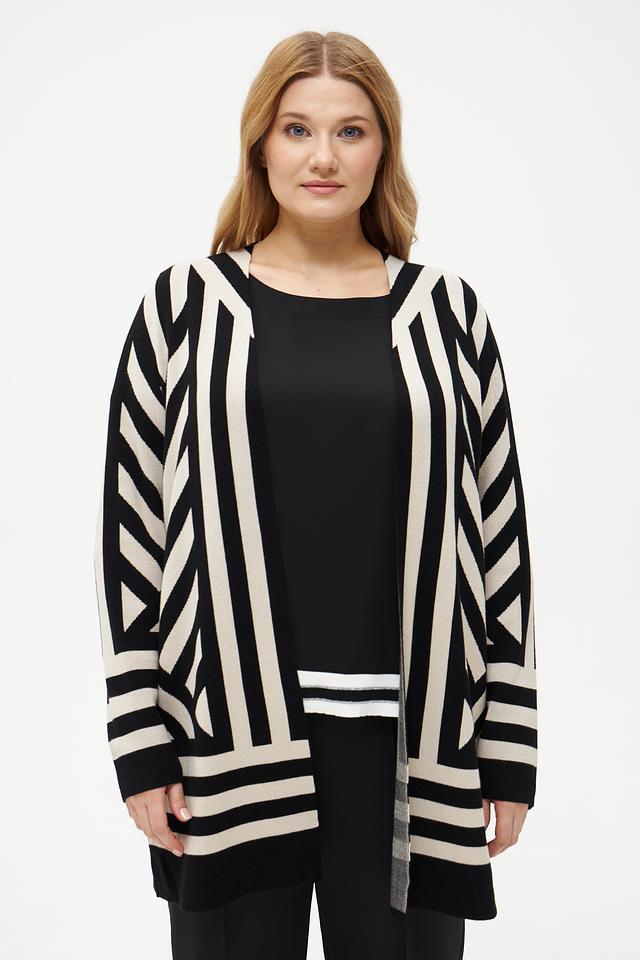 Этот жакет от Via Appia станет отличным дополнением к вашему гардеробу. Он выполнен в оригинальном дизайне с геометрическим узором из черных и бежевых полос, что делает его ярким акцентом в любом образе.