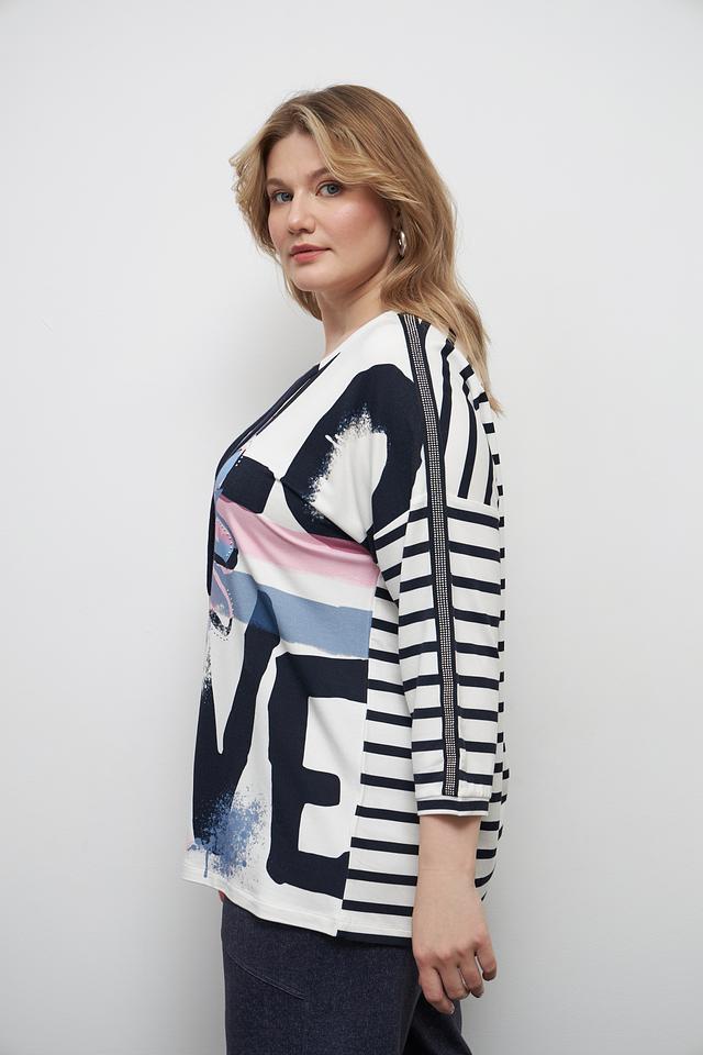 Женская футболка Via Appia DUE белого цвета с ярким абстрактным принтом и полосками на рукавах. Модель выполнена из мягкой вискозы с добавлением эластана для комфортной посадки. Состав: вискоза 95%, эластан 5%