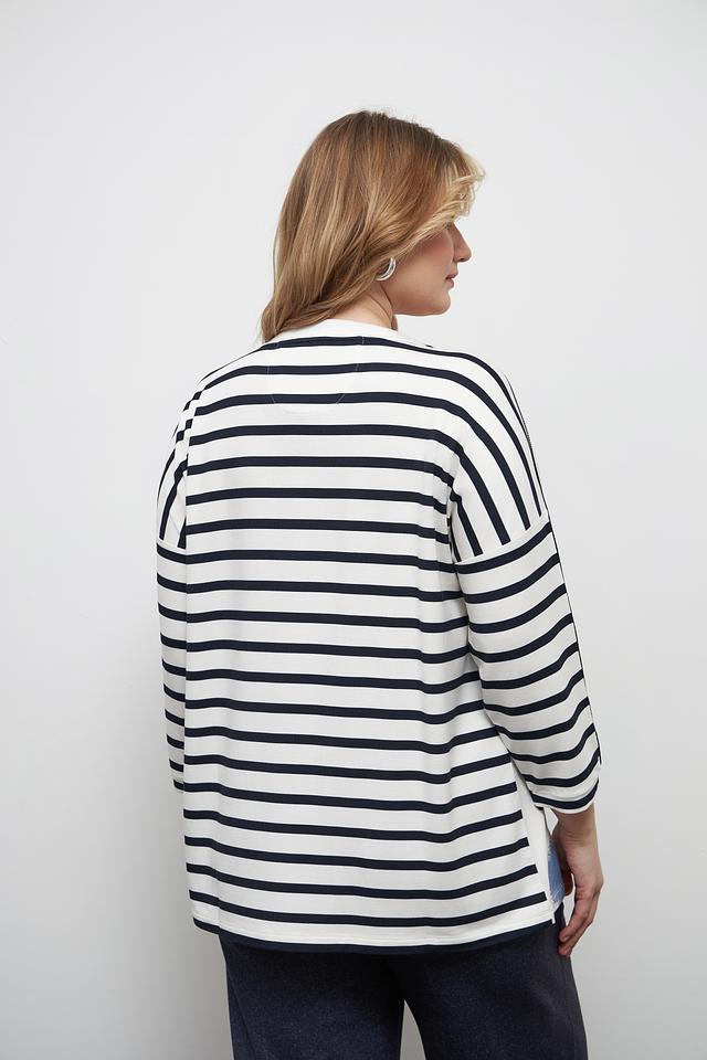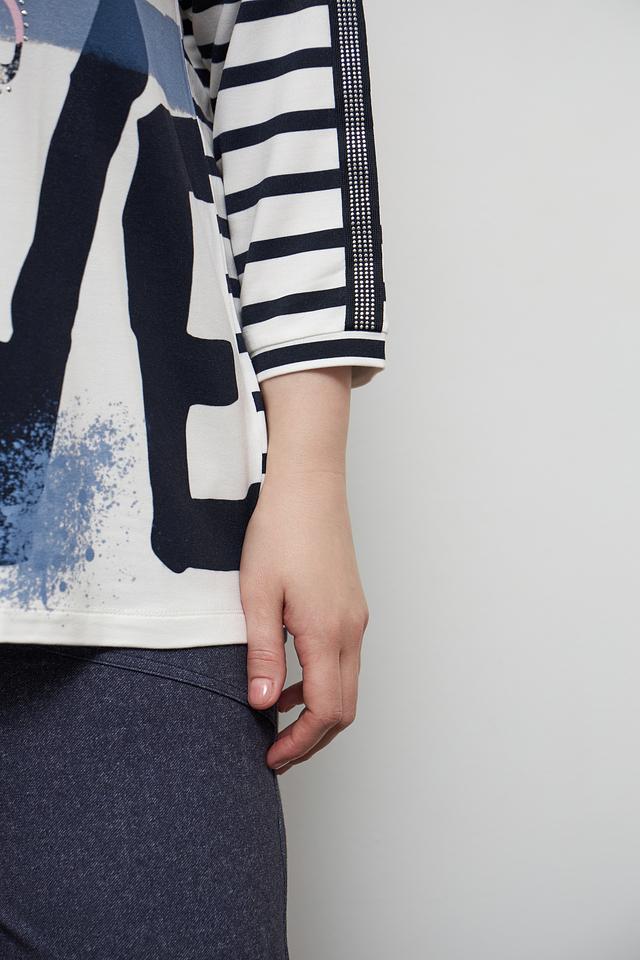 Рукава футболки декорированы контрастными полосками в бело-синем цвете, что добавляет образу динамичности. Крой футболки свободный, что обеспечивает комфорт в носке. Округлый вырез горловины.