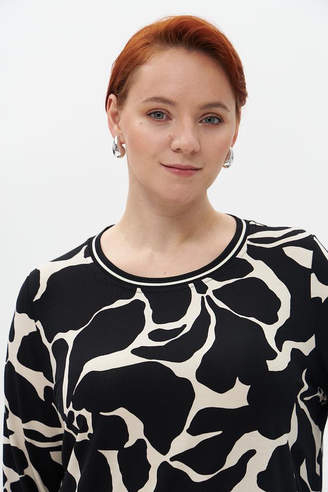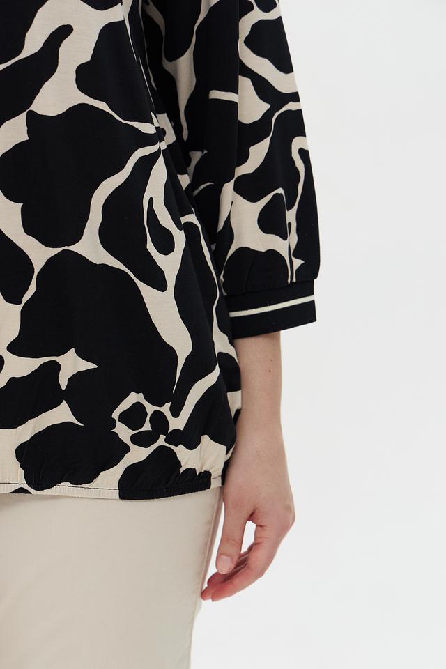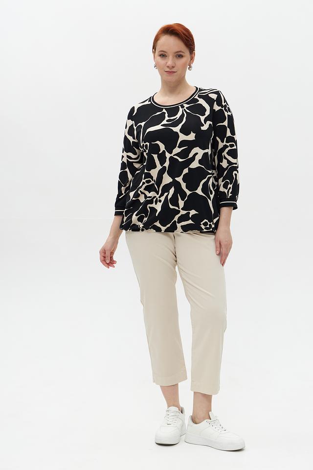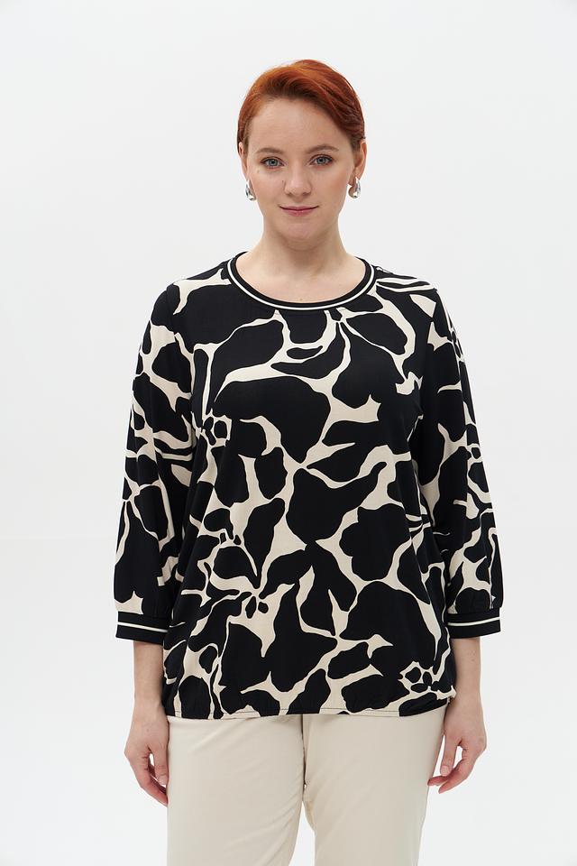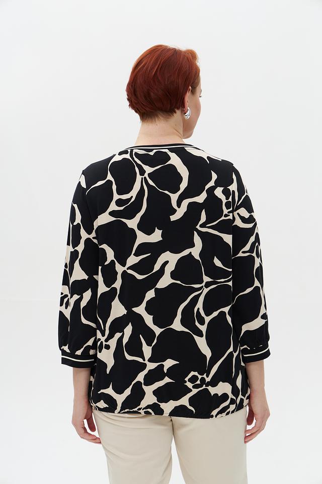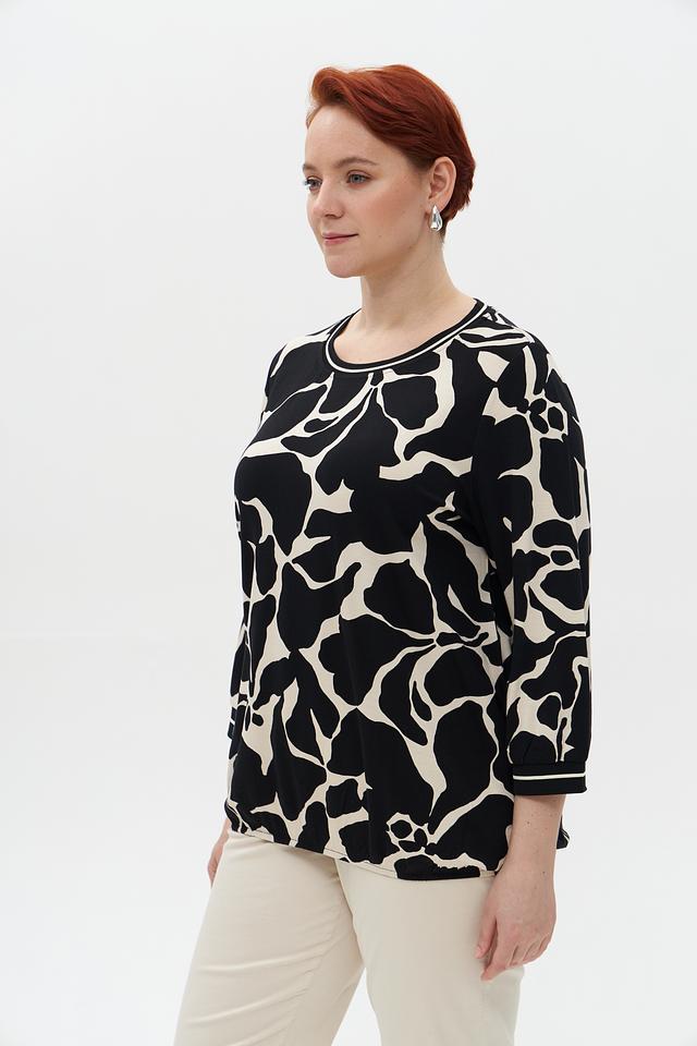 Основной цвет блузы – чёрный, а принт выполнен в белых тонах. Абстрактный узор добавляет образу оригинальности и неповторимости. Блуза имеет округлый вырез горловины и короткие рукава 3/4 с манжетами.