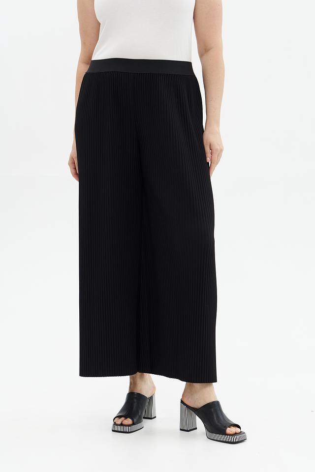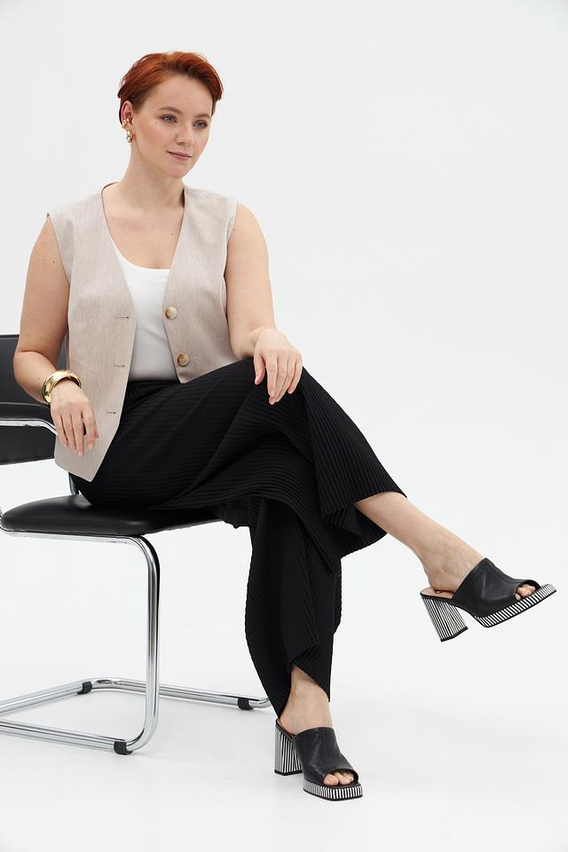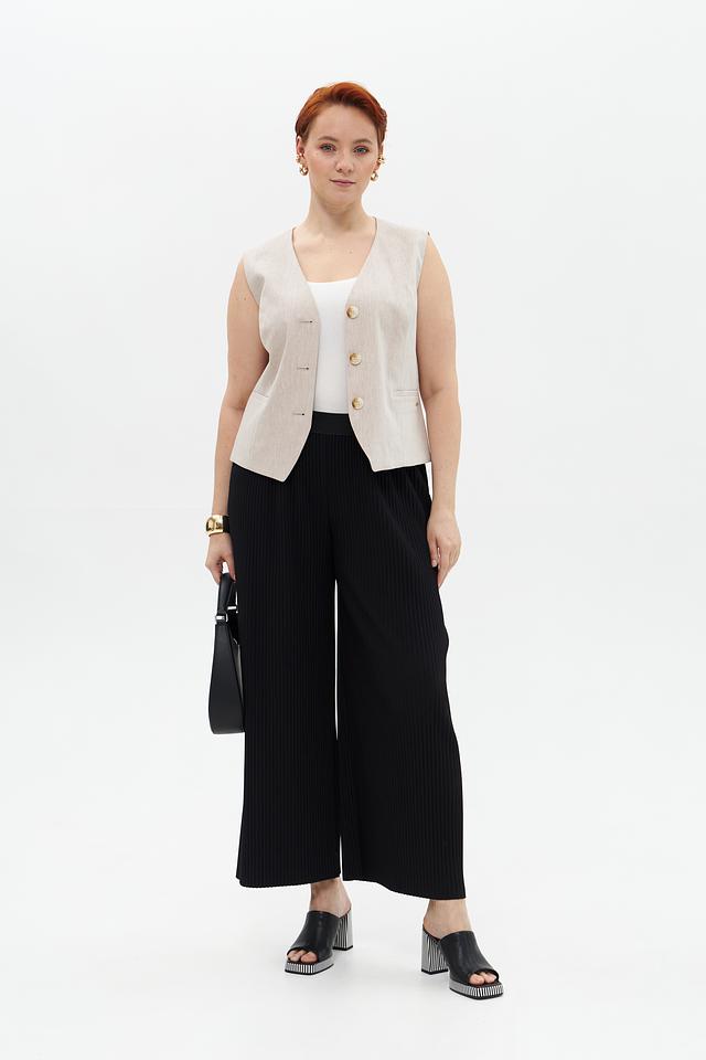 Брюки имеют завышенную талию, которая визуально удлиняет ноги и подчеркивает фигуру. Плейцы добавляют изысканности и создают эффект лёгкости и воздушности. Широкий крой палаццо обеспечивает максимальный комфорт и свободу движений.