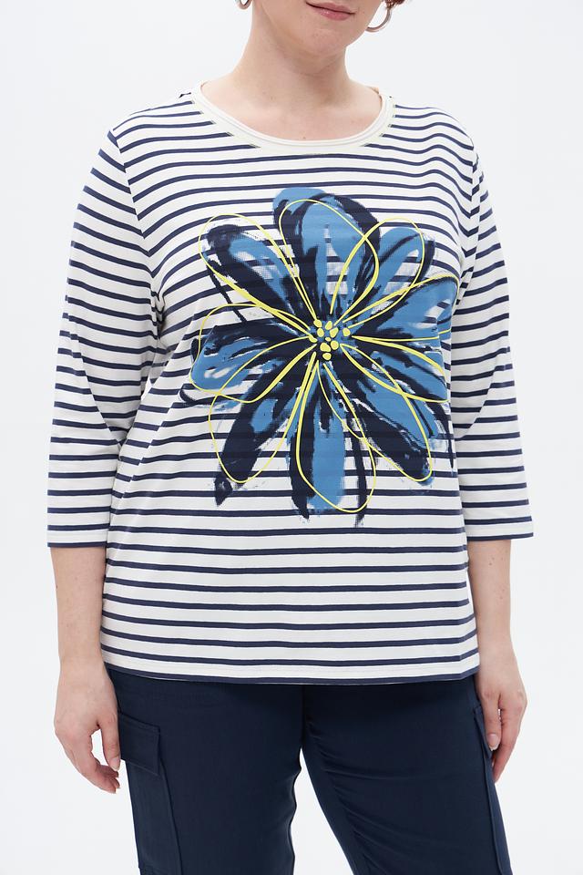 Женская футболка Via Appia синего и белого цвета с ярким цветочным принтом. Модель выполнена из мягкого и приятного к телу трикотажа с добавлением модала и эластана, обеспечивающего комфортную посадку. Состав: хлопок 47%, модал 47%, эластан 6%