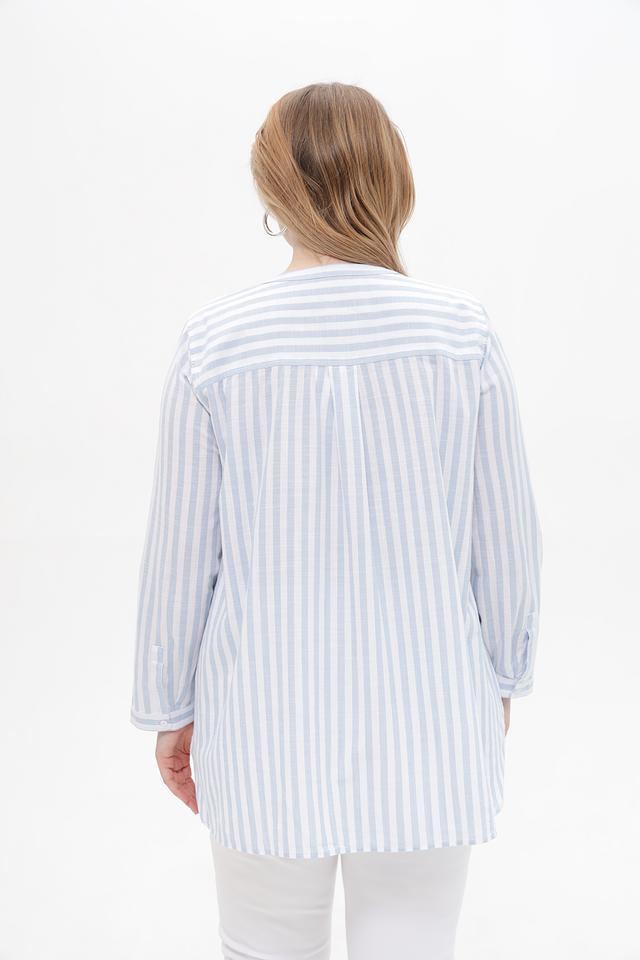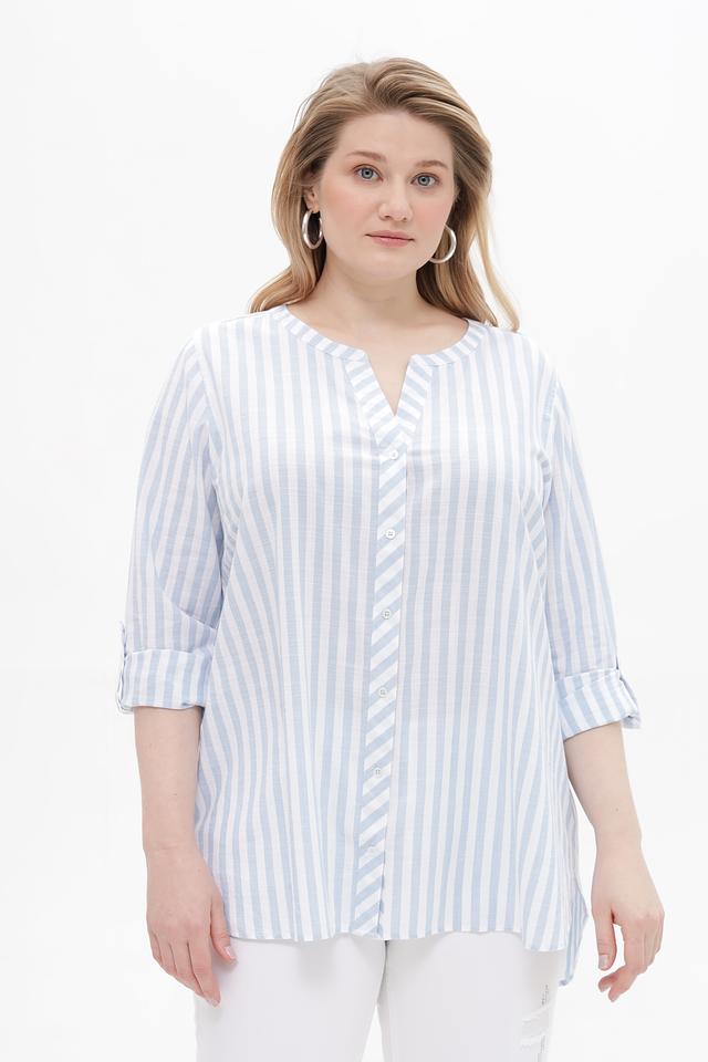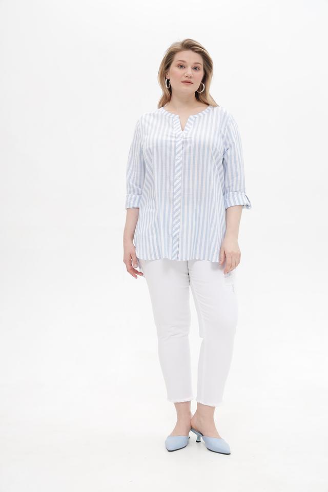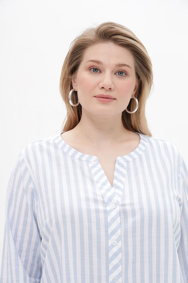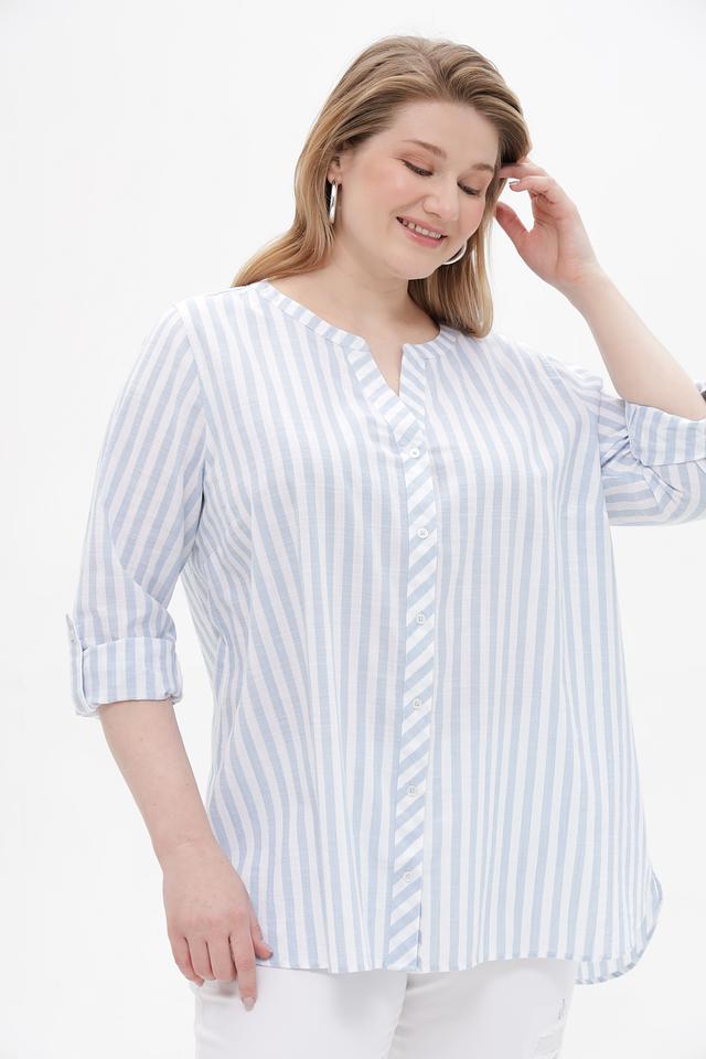Блуза имеет классический крой с V-образным вырезом и рукавами длиной 3/4, которые застегиваются на манжеты. Вертикальная полоска голубого и белого цвета визуально вытягивает силуэт и придает образу свежесть.