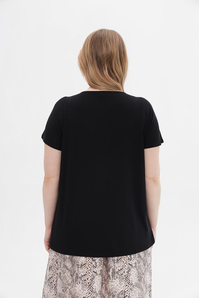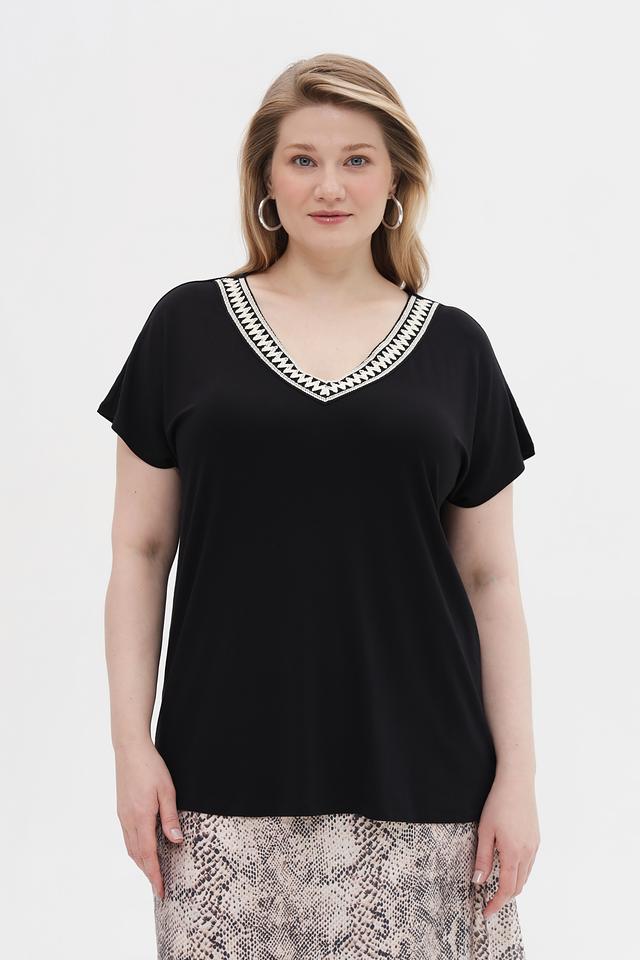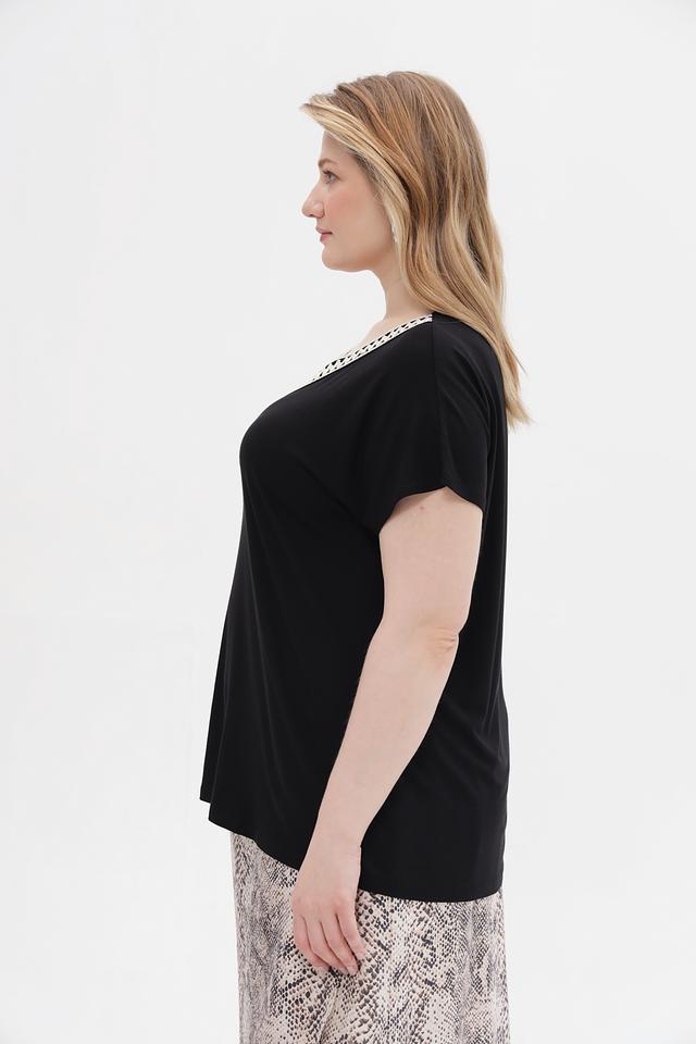 Чёрная футболка Via Appia из вискозы с добавлением эластана, украшенная декоративной отделкой по вырезу горловины. Модель свободного кроя обеспечит комфорт в повседневной носке. Состав: вискоза 95%, эластан 5%