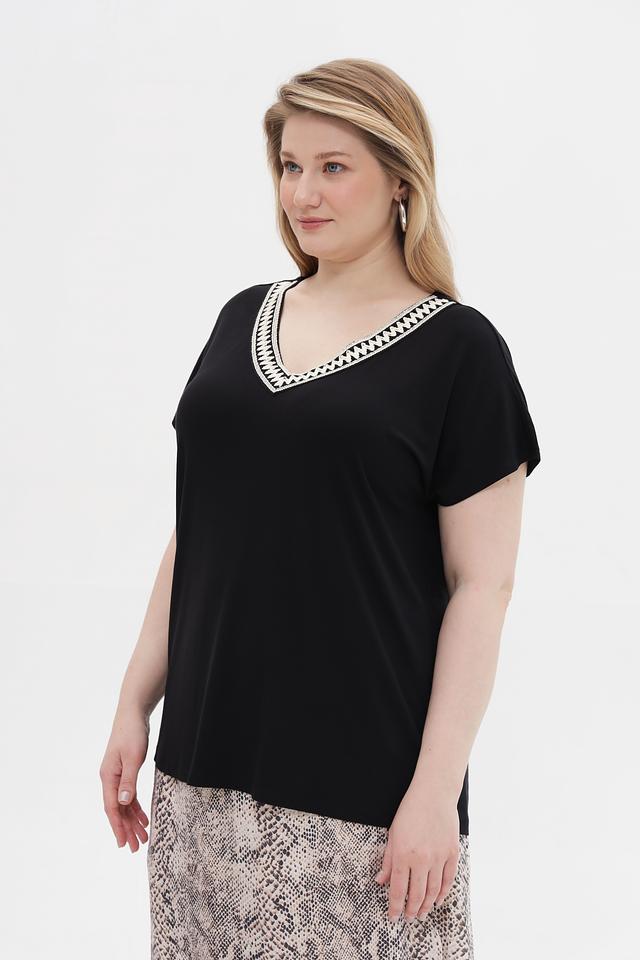 Футболка имеет классический чёрный цвет и прямой, слегка свободный крой, который подходит для разных типов фигур. Особый акцент в этой модели – декоративная отделка по вырезу горловины, придающая ей изысканность и оригинальность.