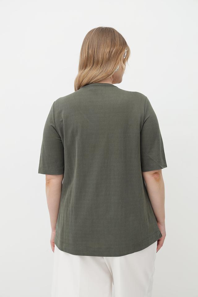 Женская футболка от бренда Via Appia выполнена в спокойном оливковом цвете. Модель имеет прямой, слегка свободный крой, обеспечивающий комфортную посадку по фигуре.