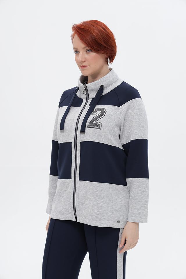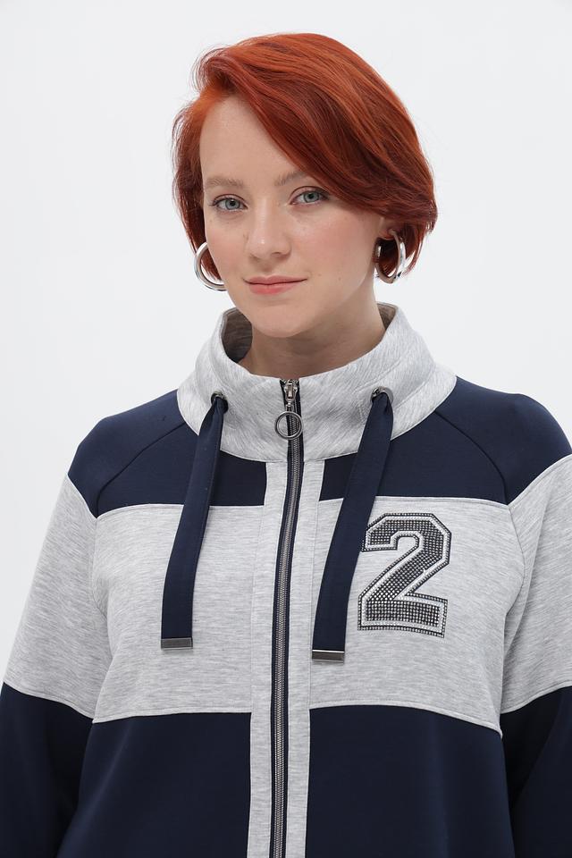 Жакет имеет удобную застежку-молнию, капюшон с кулисками и декоративный элемент в виде номера "2". Состав ткани включает вискозу, полиэстер и эластан, что обеспечивает приятные тактильные ощущения и хорошую посадку по фигуре.