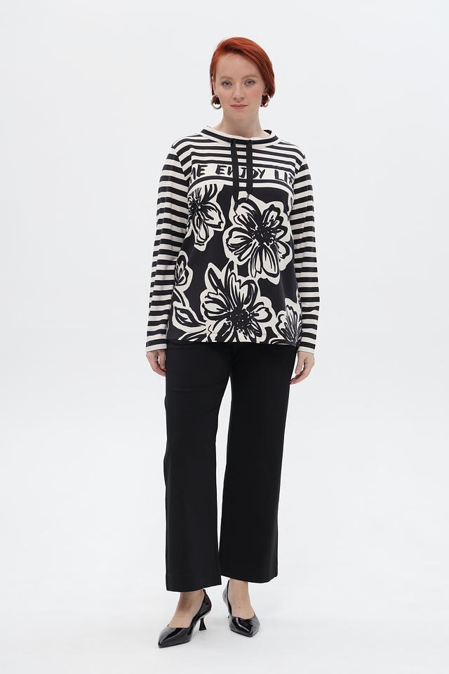 Стильный пуловер Via Appia в бело-чёрную полоску, украшенный крупным цветочным принтом и надписью. Модель с длинными рукавами и округлым вырезом горловины. Идеальный вариант для создания повседневного образа. Состав: вискоза 95%, эластан 5%