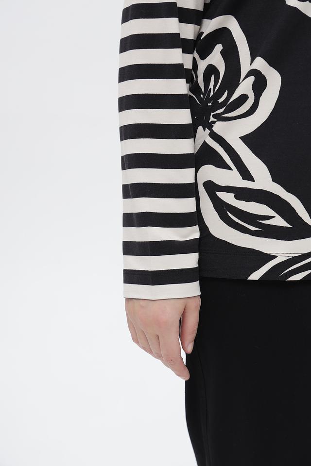 Данная модель выполнена в классической бело-чёрной полоске и украшена крупным цветочным принтом на тёмном фоне, что придает ей особую изысканность.