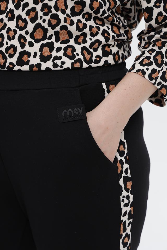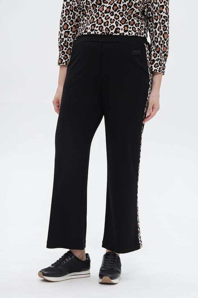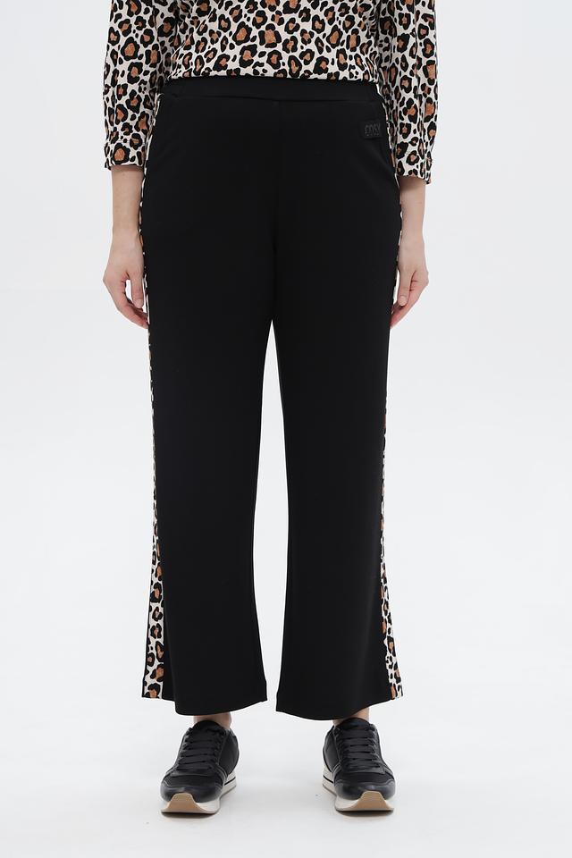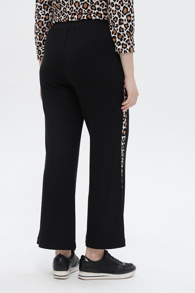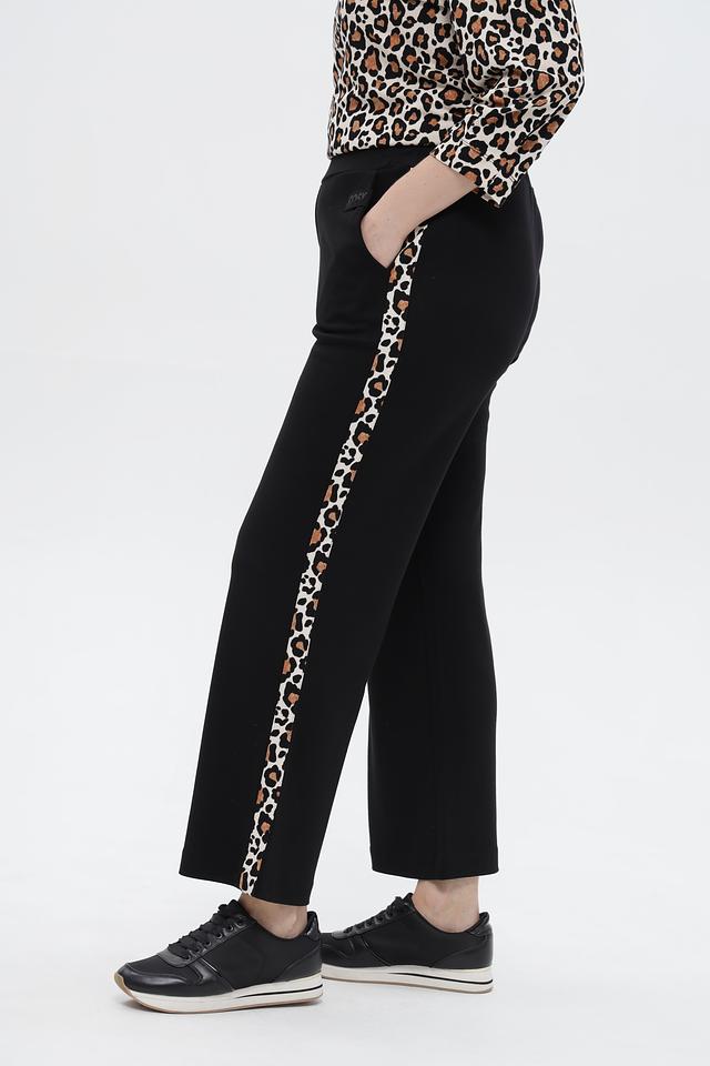 Чёрные брюки от Via Appia с боковыми полосами в леопардовый принт станут стильным дополнением к вашему гардеробу. Модель выполнена из вискозы с добавлением полиэстера и эластана, обеспечивающих комфорт и свободу движений. Состав: вискоза 84%, полиэстер 14%, эластан 2%