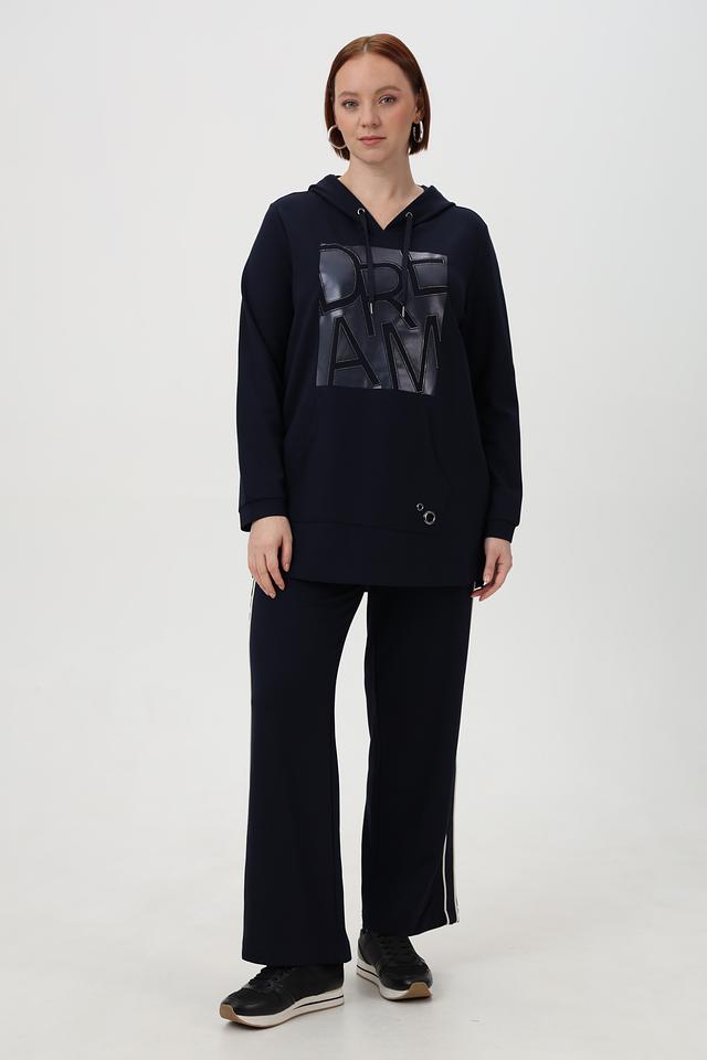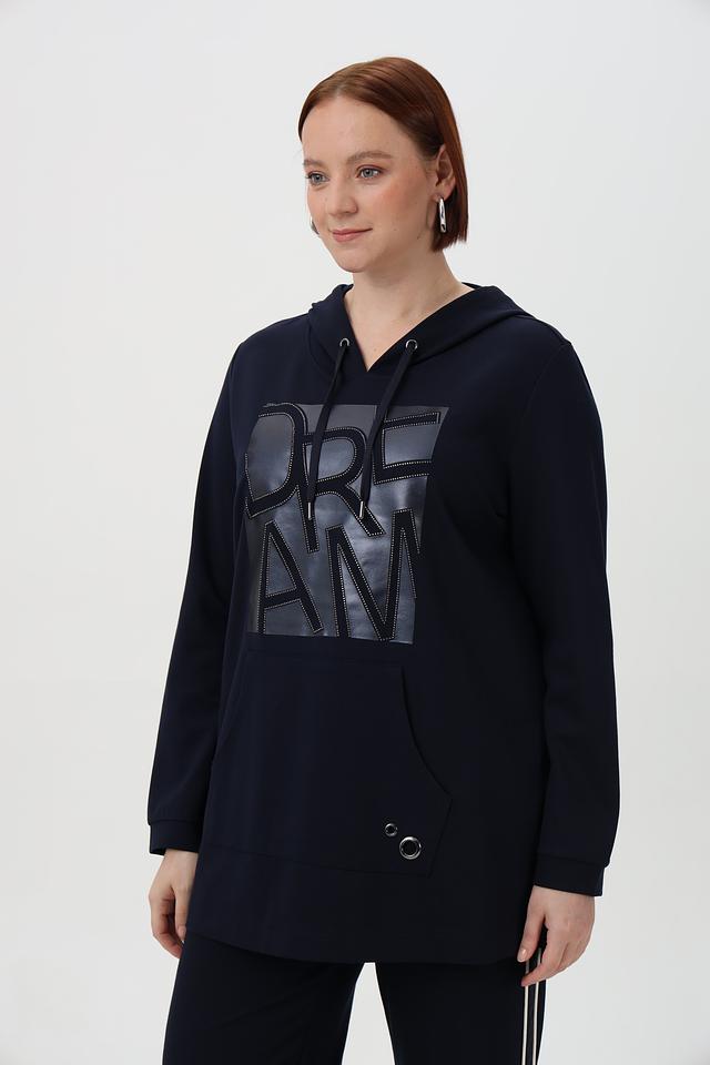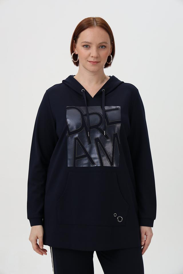 Женская толстовка Via Appia темно-синего цвета с надписью "DREAM" — стильный и комфортный выбор для повседневной носки. Модель выполнена из мягкого трикотажа с добавлением вискозы, полиамида и эластана, обеспечивающего удобную посадку. Состав: вискоза 70%, полиамид 25%, эластан 5%