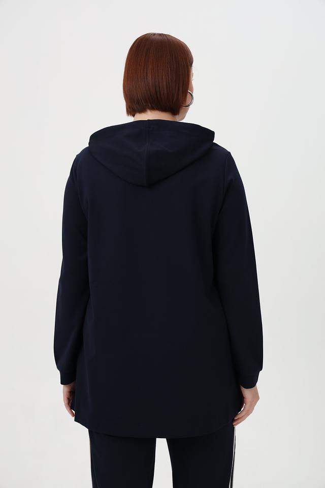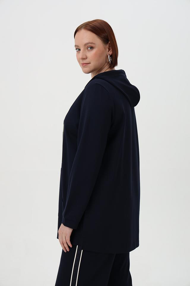 Толстовка имеет свободный крой, капюшон и кенгуру-карман. Дополнительный декоративный элемент – два небольших отверстия с металлическими люверсами на боковой части толстовки. Рукава и низ изделия оформлены манжетами, обеспечивающими комфортную посадку.