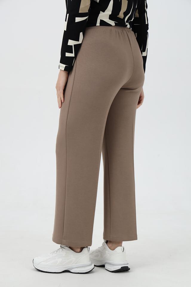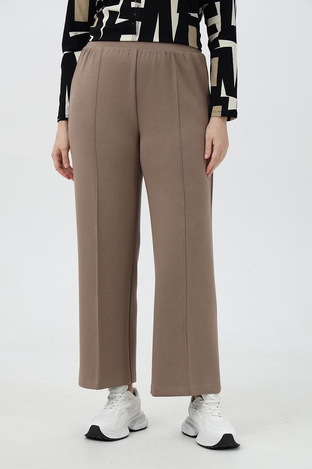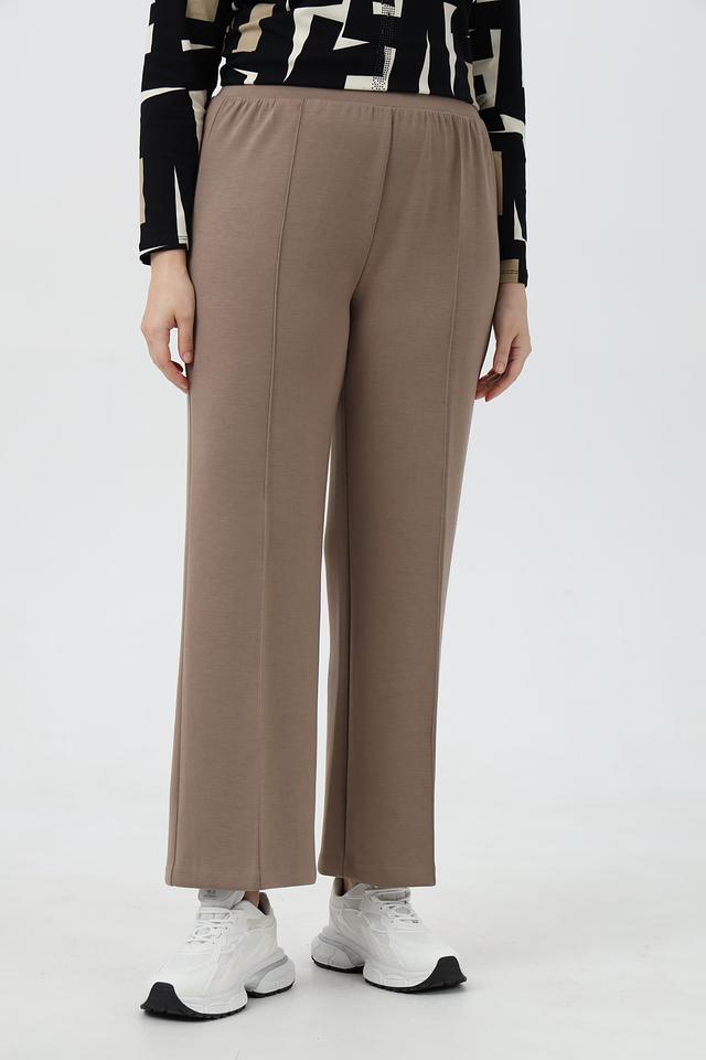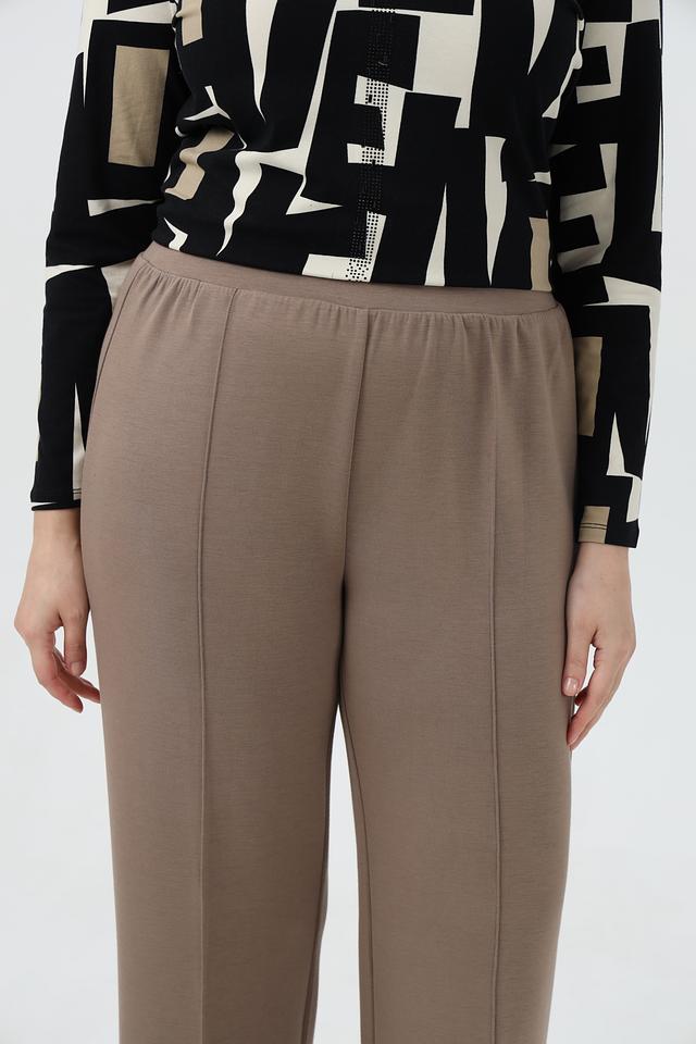 Брюки выполнены в приятном бежевом цвете, который легко сочетается с другими элементами одежды. Прямой крой обеспечивает свободу движений, а эластичный пояс гарантирует удобную посадку по фигуре. Модель имеет вертикальные вытачки спереди, которые визуально удлиняют силуэт.