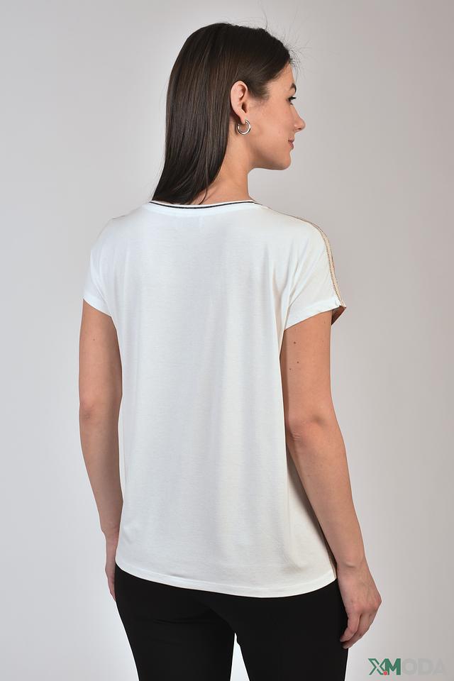 Блуза имеет свободный крой, который обеспечивает комфорт в носке, и короткие рукава. Воротник выполнен в виде небольшой стойки с черной окантовкой. По бокам изделия расположены декоративные вставки с небольшими разрезами.