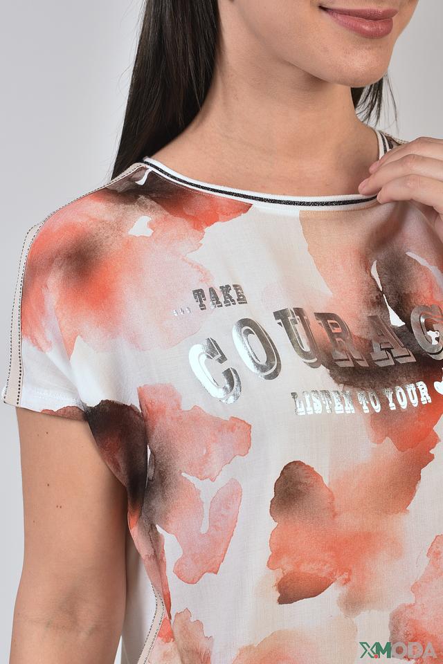 Эта стильная блуза от Via Appia станет отличным дополнением к вашему гардеробу. Выполнена в белом цвете и украшена ярким цветочным принтом в оттенках оранжевого и коричневого, а также надписью "Courage".