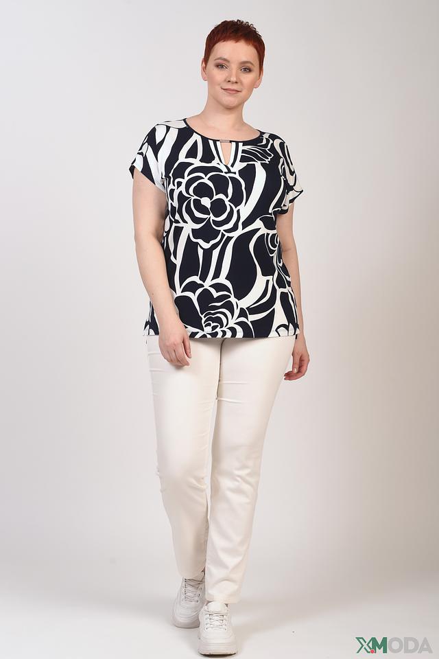 Основной цвет блузы – черный, а главным акцентом является крупный цветочный принт в белых тонах. Такой рисунок придает образу свежесть и оригинальность.