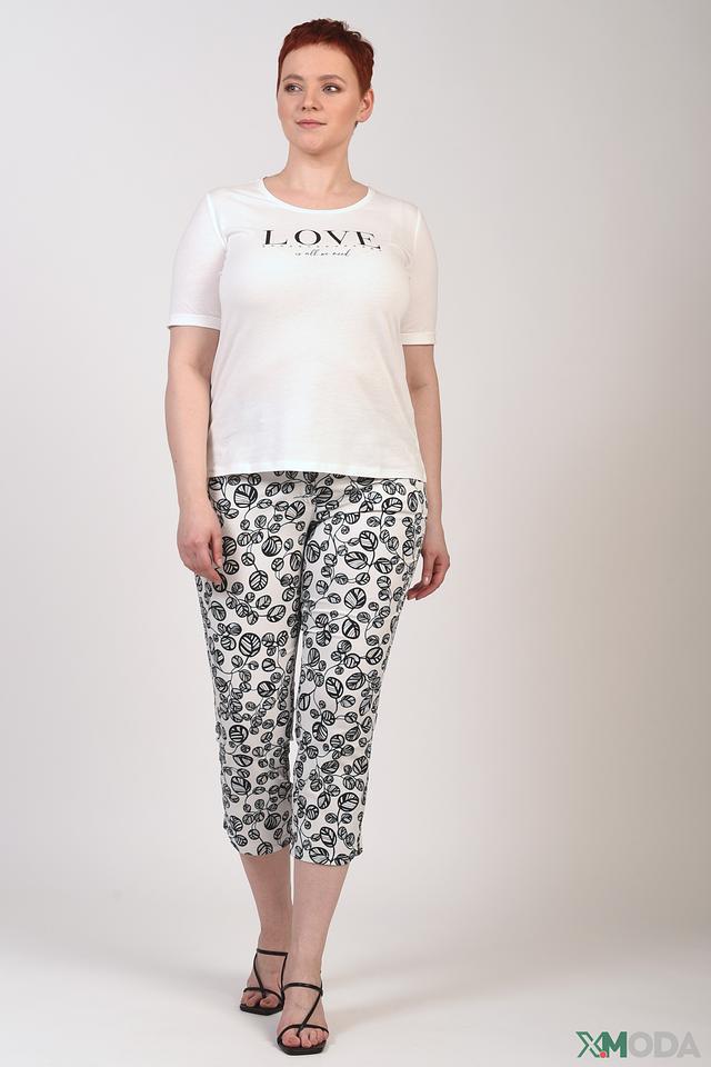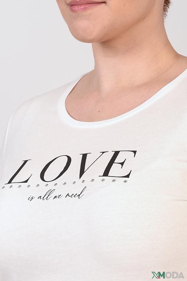 Футболка имеет классический прямой крой и короткие рукава. На передней части изделия расположен стильный принт с надписью "LOVE", выполненный в чёрном цвете. Этот принт добавляет футболке индивидуальности и выразительности.