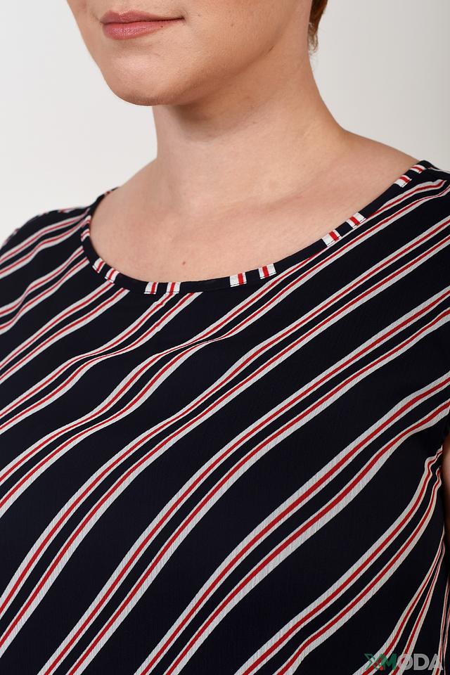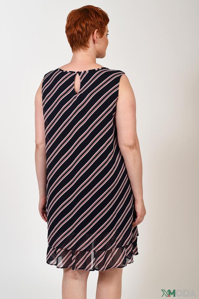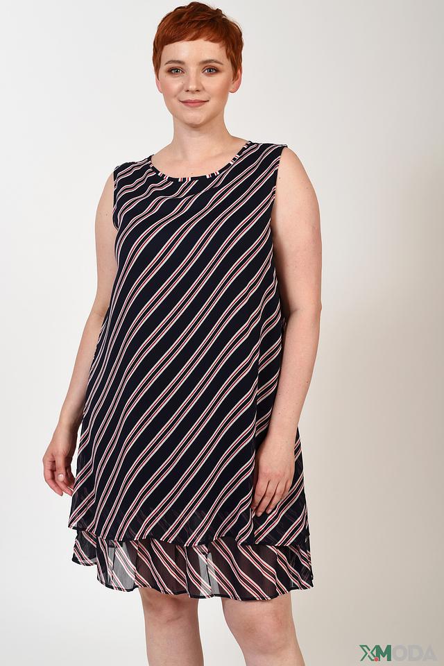 Платье украшено классическим черно-белым полосатым принтом, который всегда актуален. Вырез горловины округлый, а рукава отсутствуют, что делает платье идеальным выбором для теплой погоды. Многослойный подол придает образу динамичность и легкость.