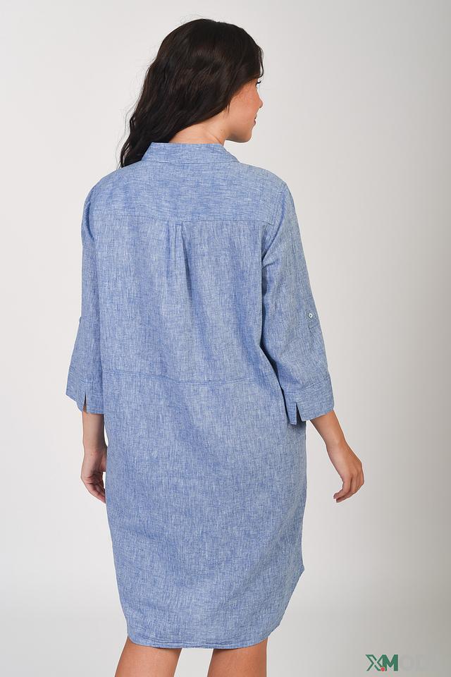 Платье имеет прямой силуэт, рубашечный крой и застежку на пуговицы по всей длине. Рукава длиной 3/4 с манжетами, которые можно зафиксировать пуговицами. Модель дополнена накладными карманами на груди.
