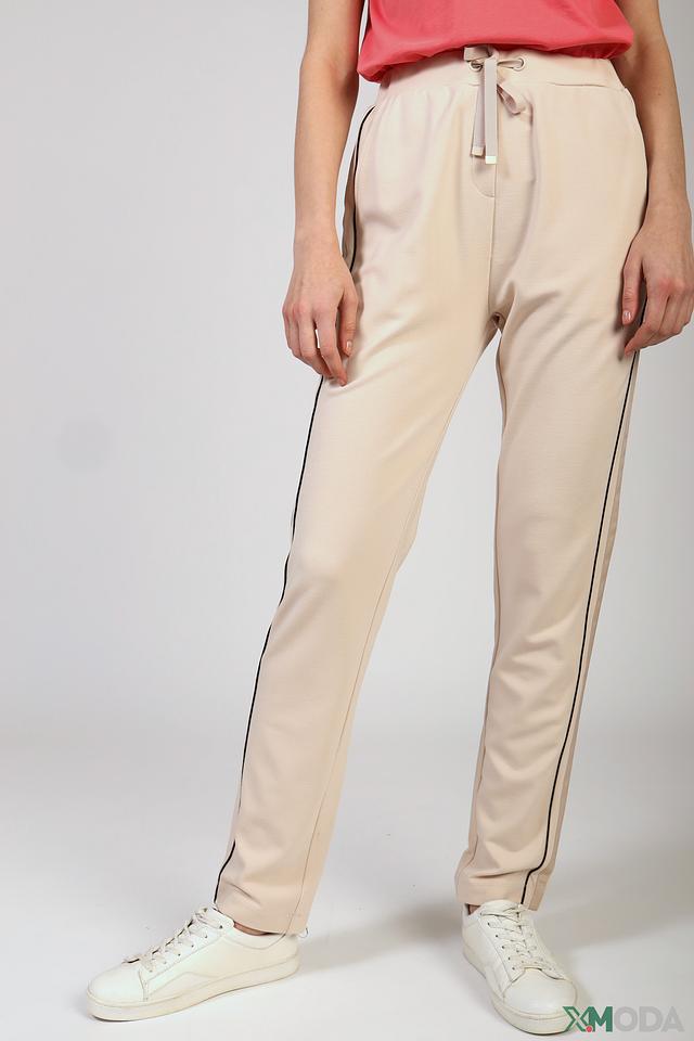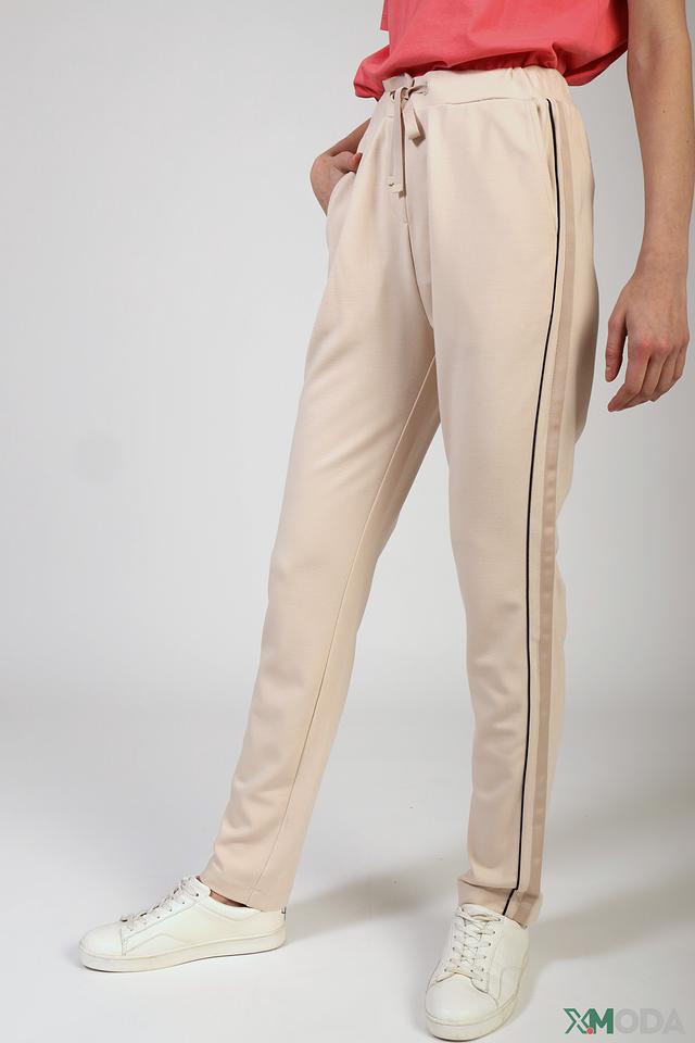 Брюки выполнены в приятном бежевом цвете, который легко сочетается с различными элементами одежды. Декоративные полоски по бокам добавляют динамики и оригинальности. Пояс на резинке обеспечивает удобную посадку и свободу движений.