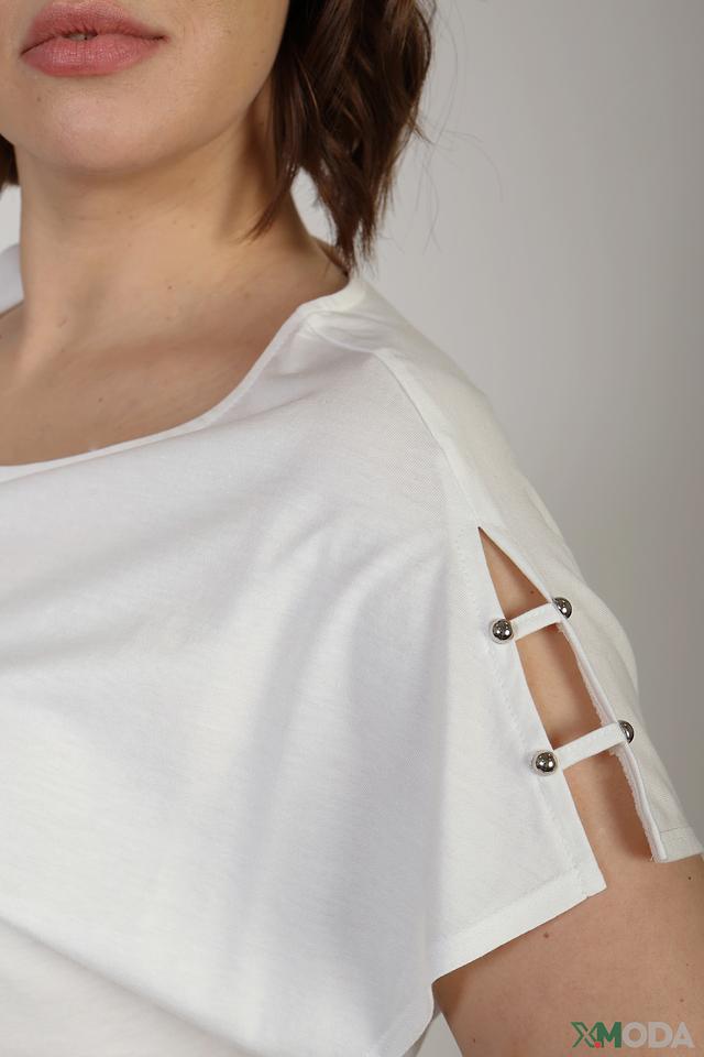 Особенностью данной модели являются декоративные разрезы на плечах, которые придают ей оригинальность и лёгкость. Футболка имеет прямой крой и короткие рукава, что обеспечивает комфорт в жаркую погоду.