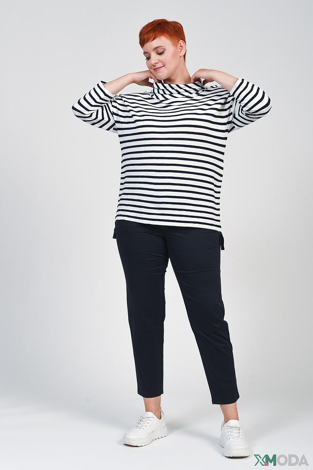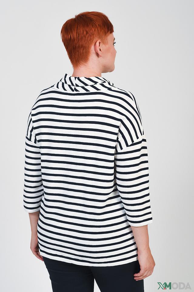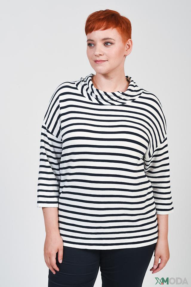 Женский джемпер Via Appia сине-белого цвета с полоской и высоким горлом. Модель выполнена из мягкой вискозы с добавлением полиэстера и эластана, обеспечивающих комфорт и хорошую посадку. Состав: вискоза 91%, полиэстер 8%, эластан 1%