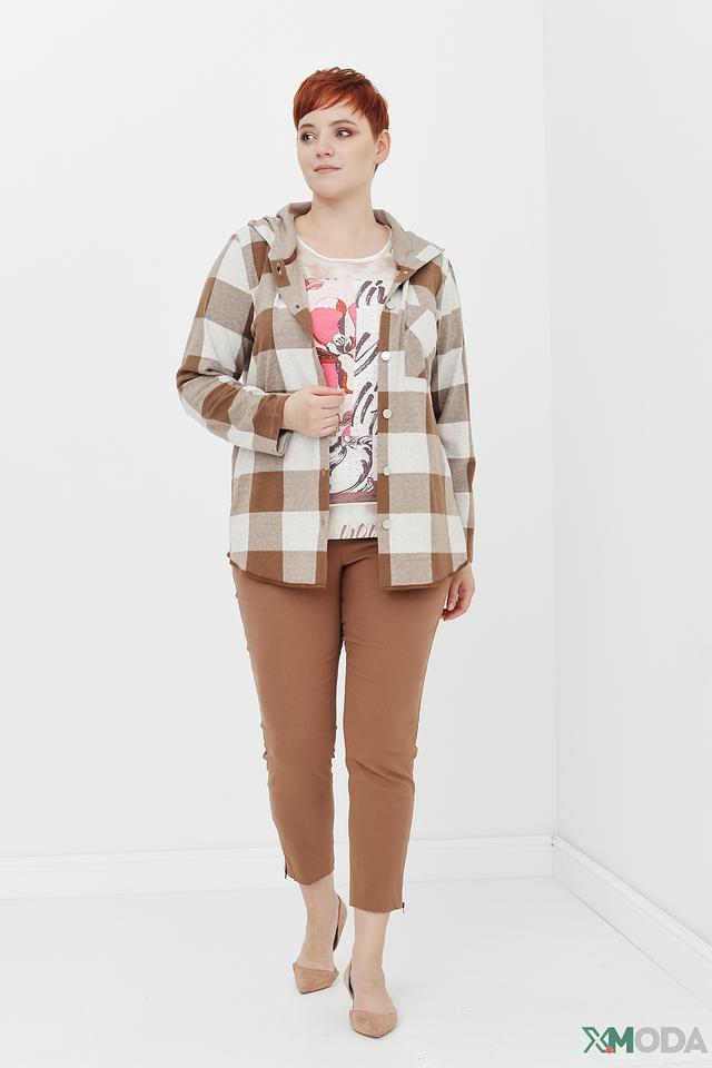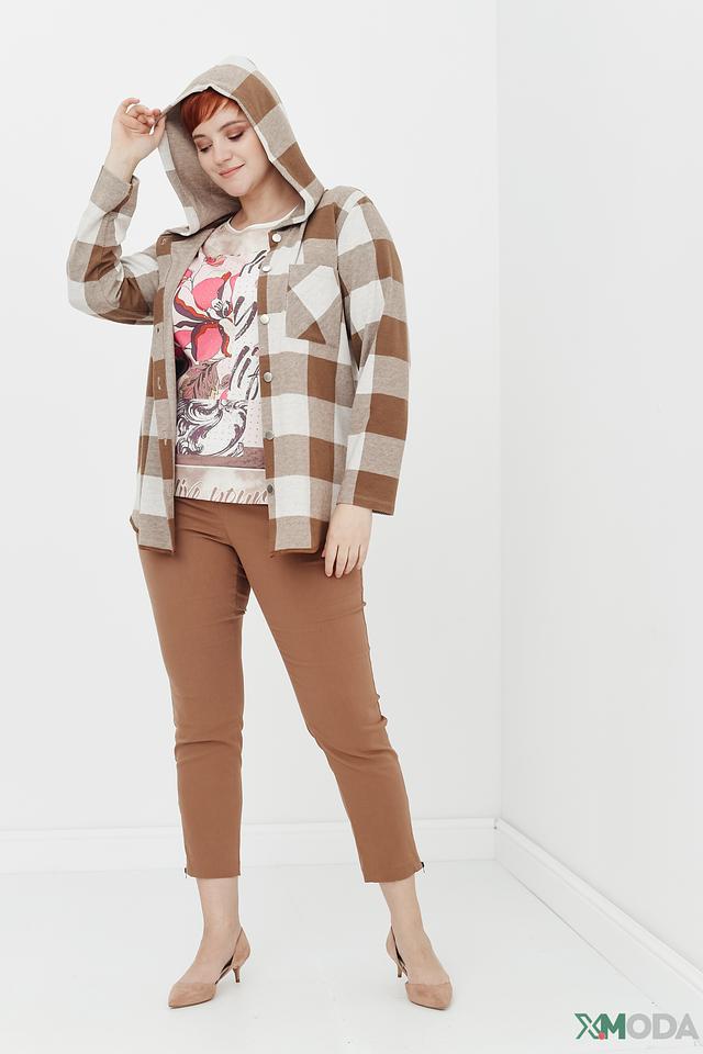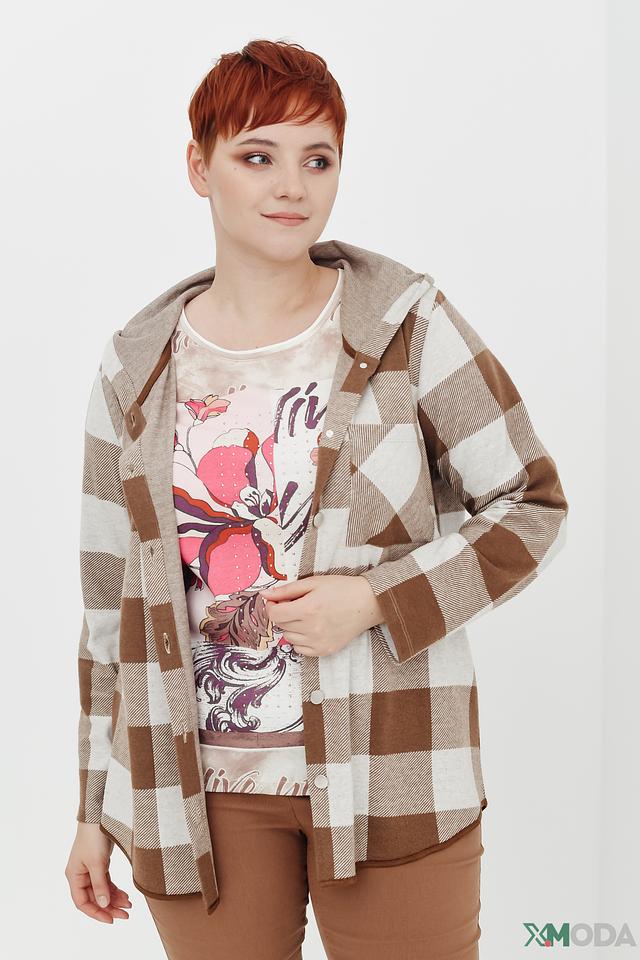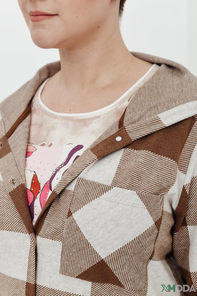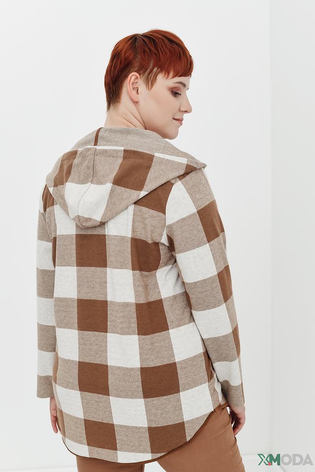 Жакет Via Appia в клетку бежево-коричневого цвета – стильное и комфортное решение для создания повседневных образов. Модель с капюшоном и застежкой на пуговицы, выполненная из мягкой ткани с добавлением вискозы и эластана. Состав: полиэстер 63%, вискоза 34%, эластан 3%