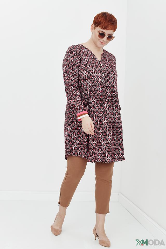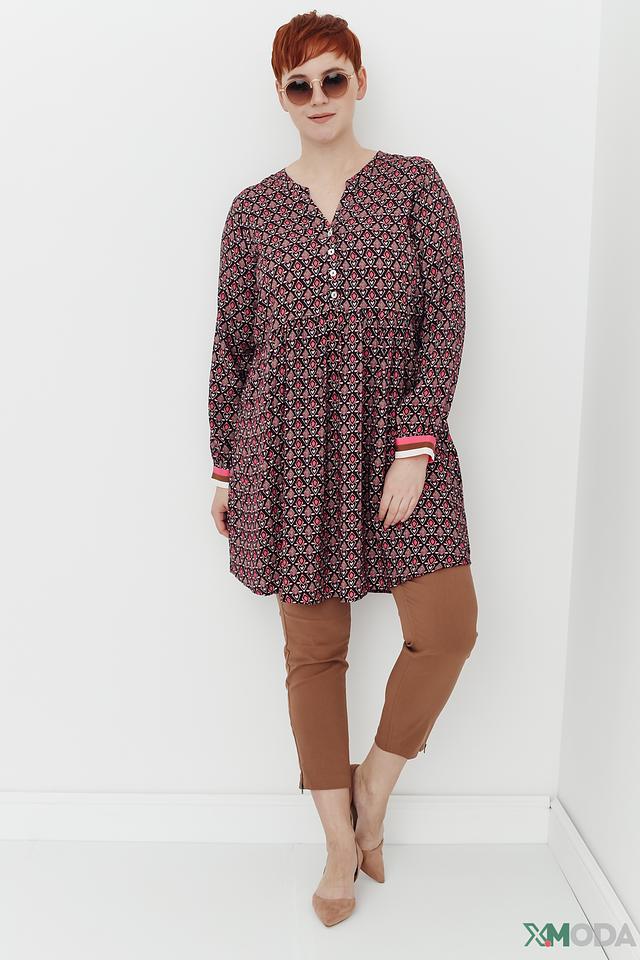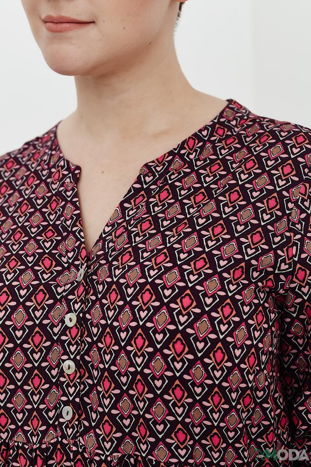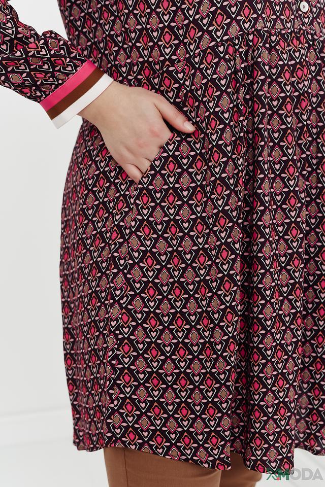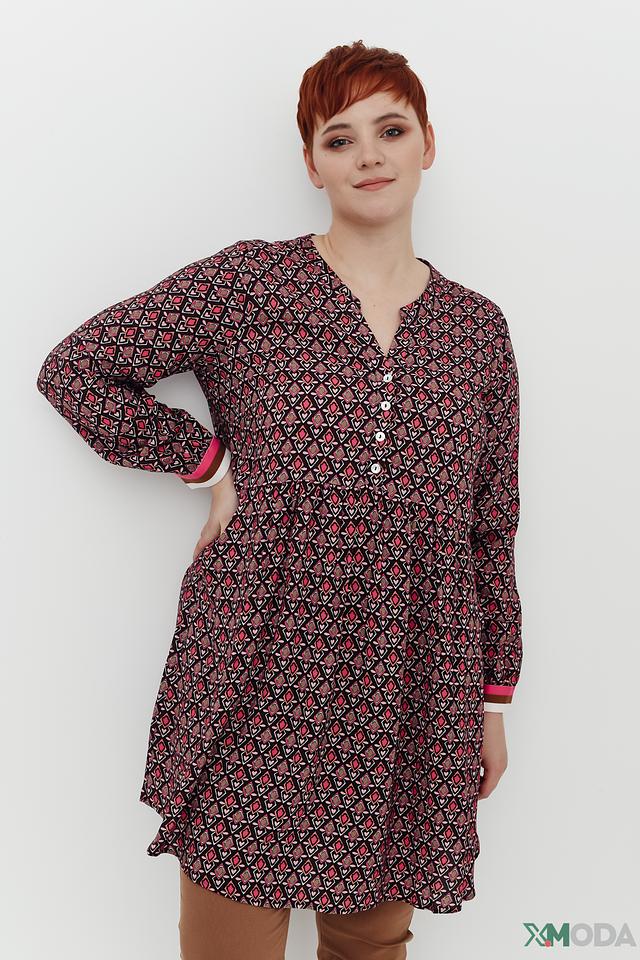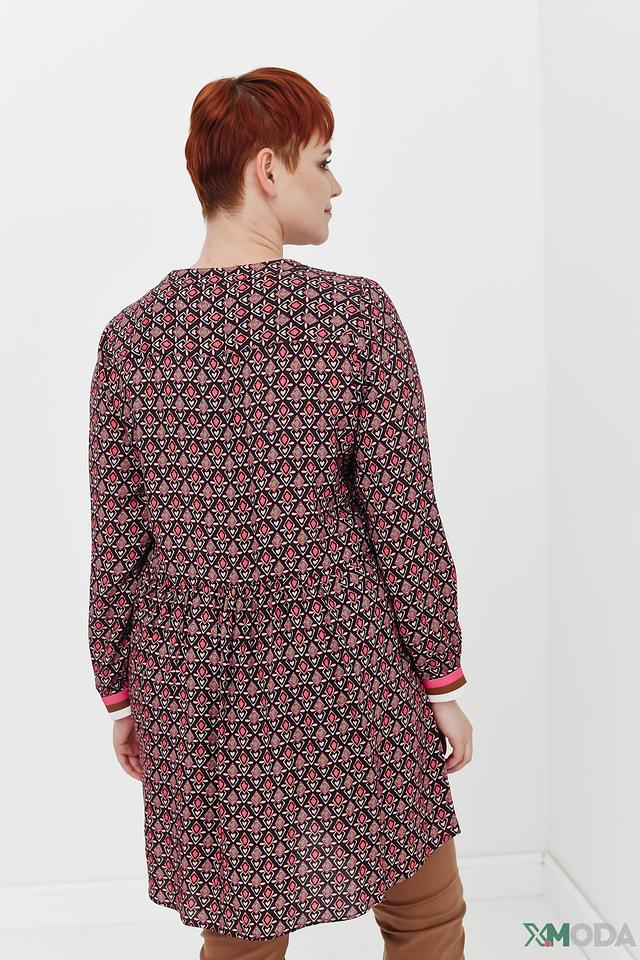 Платье имеет свободный крой, который не сковывает движения и подходит для разных типов фигур. V-образный вырез горловины и длинные рукава добавляют элегантности образу. Яркий геометрический принт делает платье оригинальным и привлекательным.