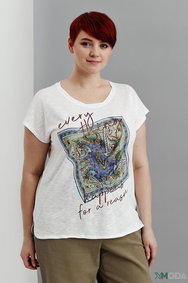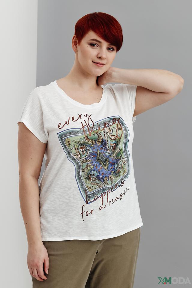 Женская футболка Via Appia белого цвета с ярким графичным принтом. Модель свободного кроя с короткими рукавами выполнена из мягкого хлопка с добавлением вискозы для комфорта и приятных ощущений. Состав: хлопок 52%, вискоза 48%