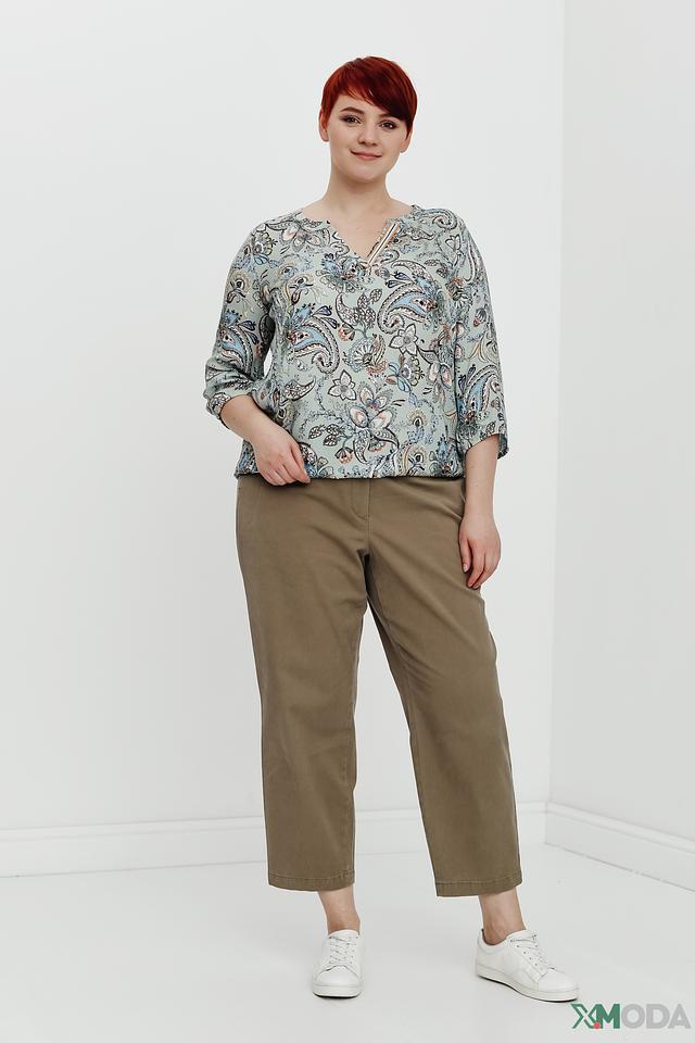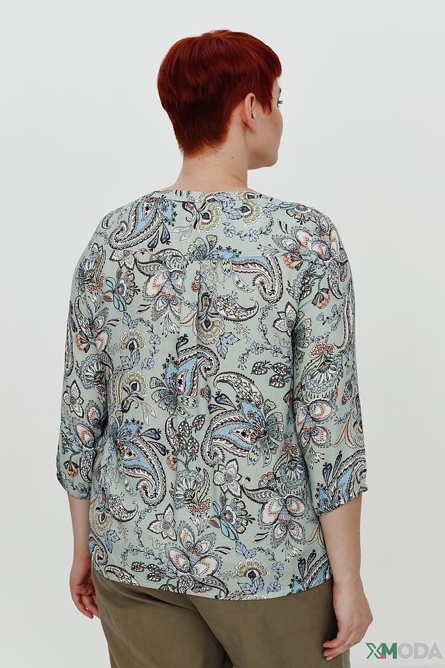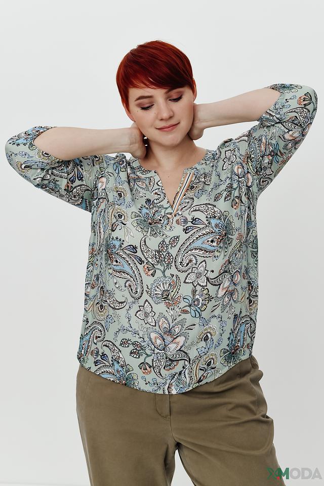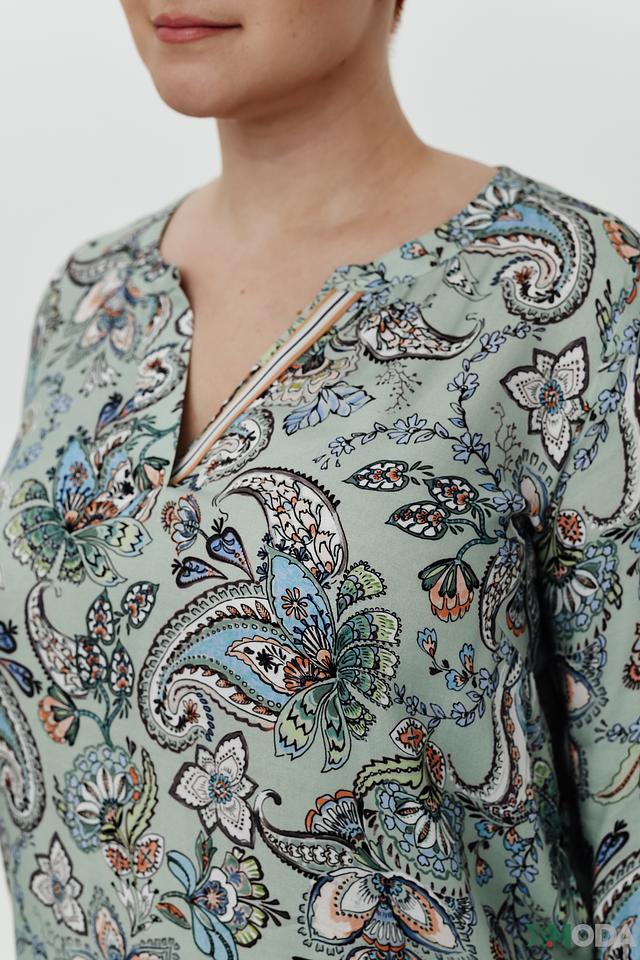 Основной цвет блузы – светло-зелёный, который служит прекрасным фоном для яркого и детализированного цветочного принта. Принт выполнен в сочетании голубых, оранжевых и коричневых оттенков, создавая эффектный и запоминающийся образ.