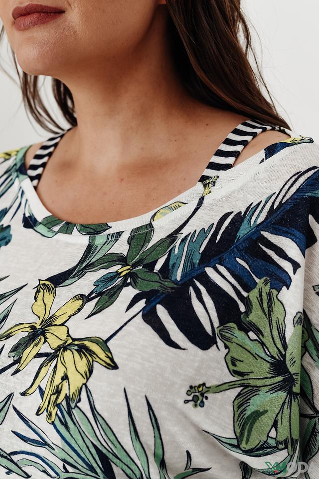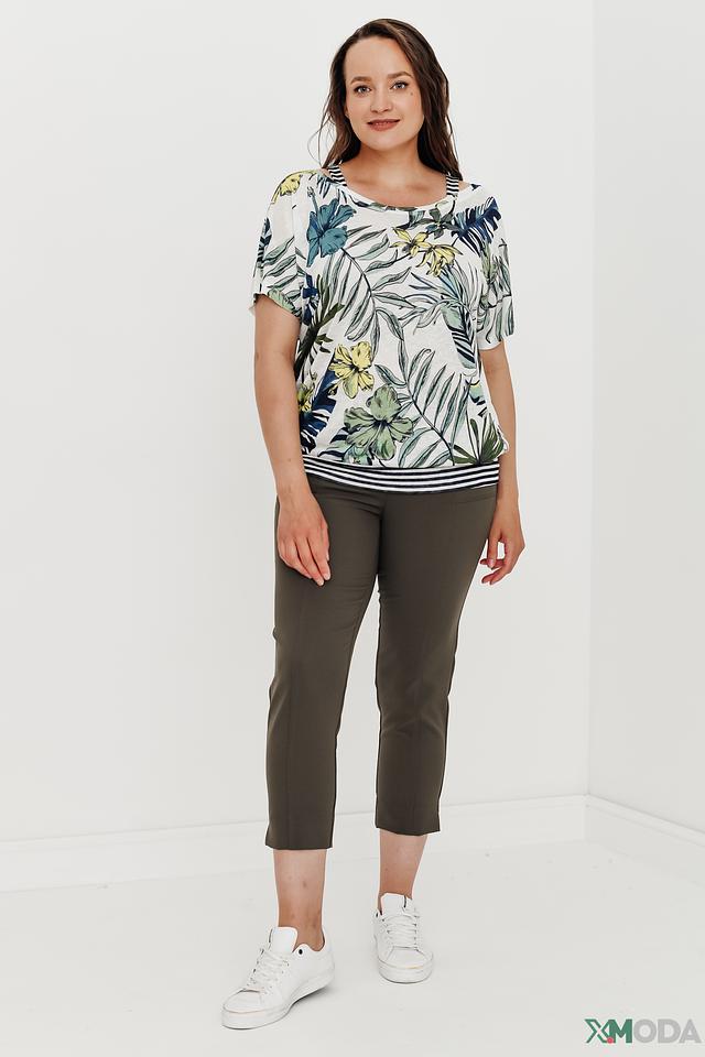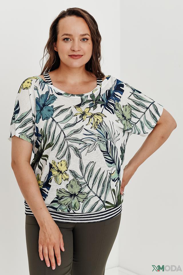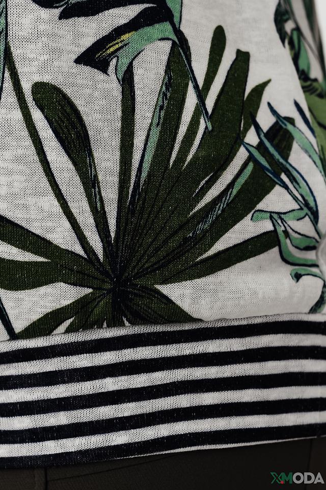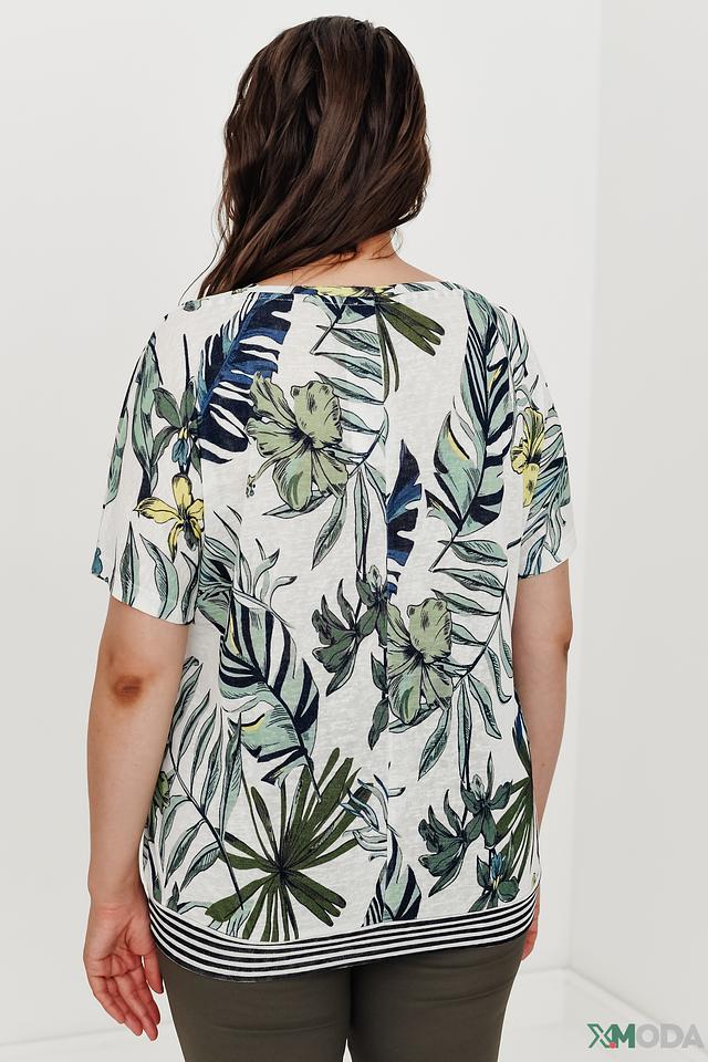 Блуза имеет свободный крой, который не сковывает движений, и короткие рукава-крылышки, добавляющие образу легкости и воздушности. Основной цвет блузы – белый, а украшает ее красочный принт с изображением тропических листьев и цветов в зеленых, синих и желтых оттенках.