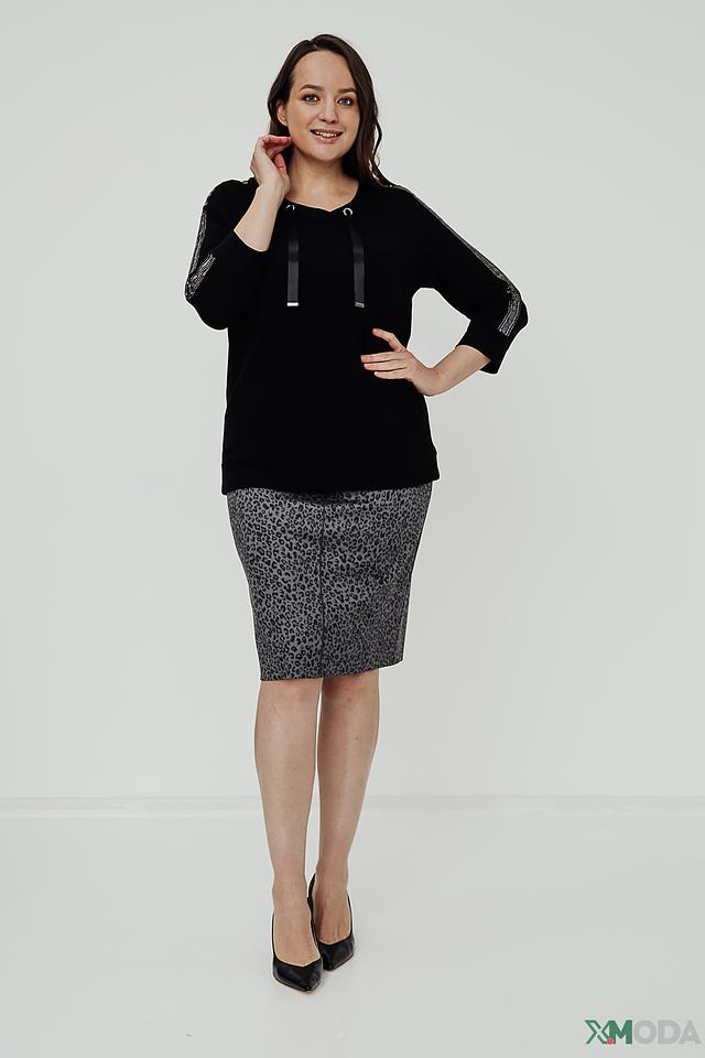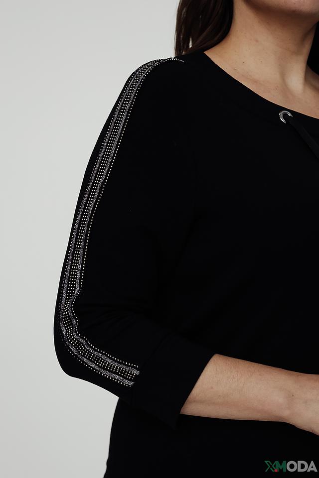 Пуловер имеет удобный крой, рукава три четверти и V-образный вырез горловины, который украшен двумя шнурками. Рукава декорированы сверкающими элементами, добавляющими образу изысканности.
