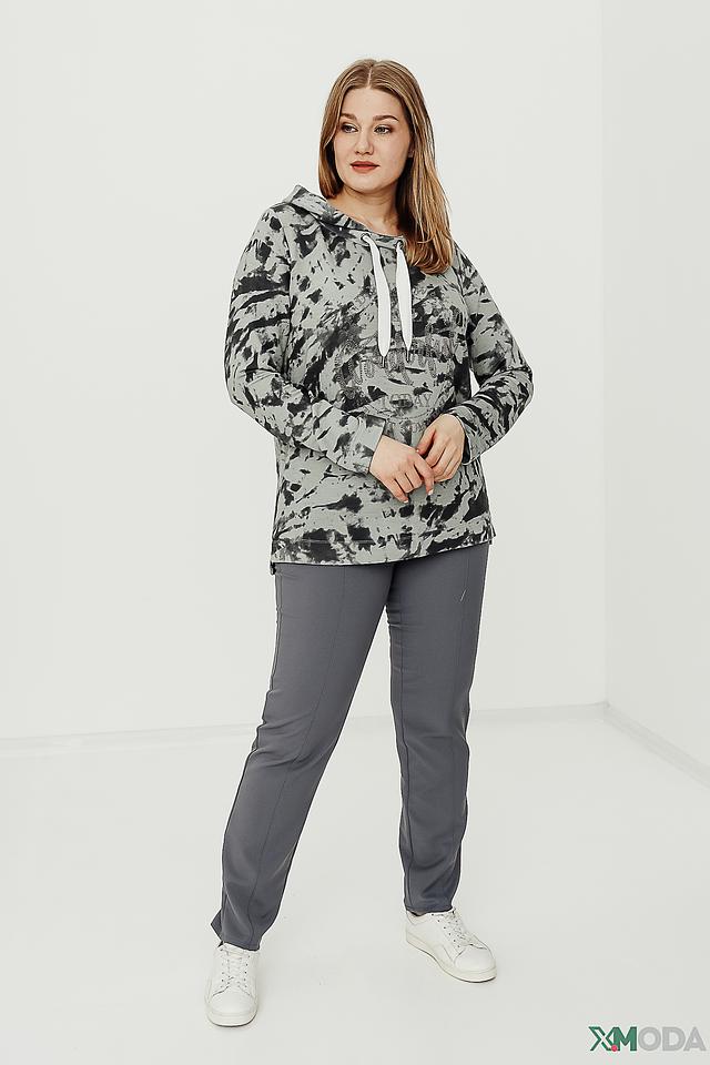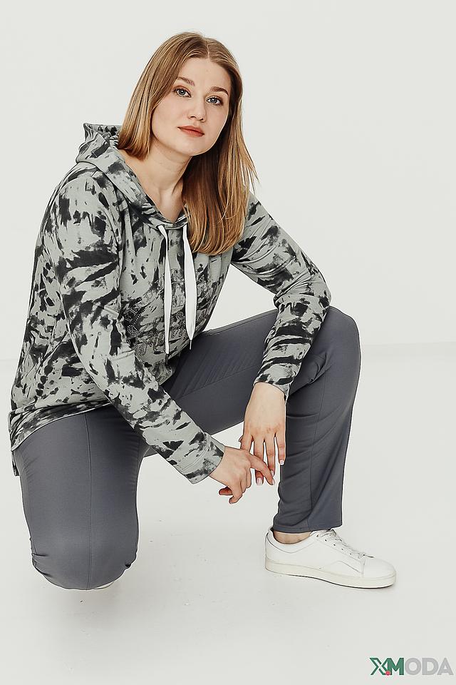 Пуловер имеет свободный крой, капюшон и длинные рукава. Его украшает эффектный принт в виде размытых пятен серого и черного цветов, создающий современный и динамичный образ.