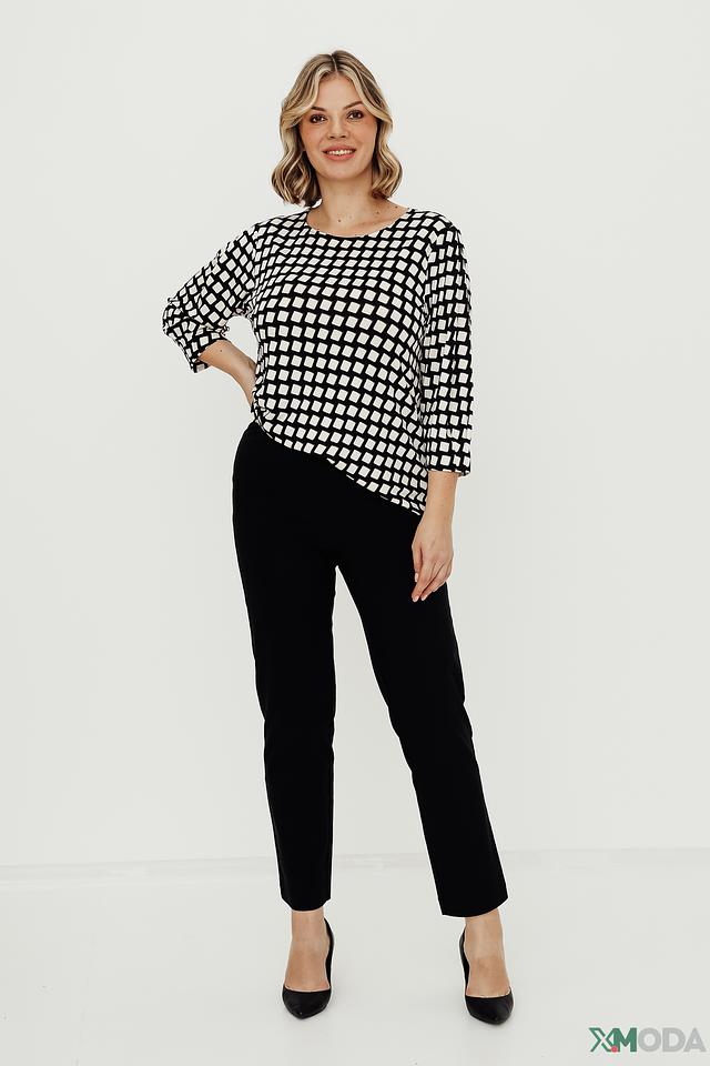 Основной цвет футболки – чёрный, украшен контрастным белым геометрическим принтом в виде ромбов. Благодаря сочетанию вискозы и эластана, футболка приятна к телу, хорошо драпируется и не сковывает движений.