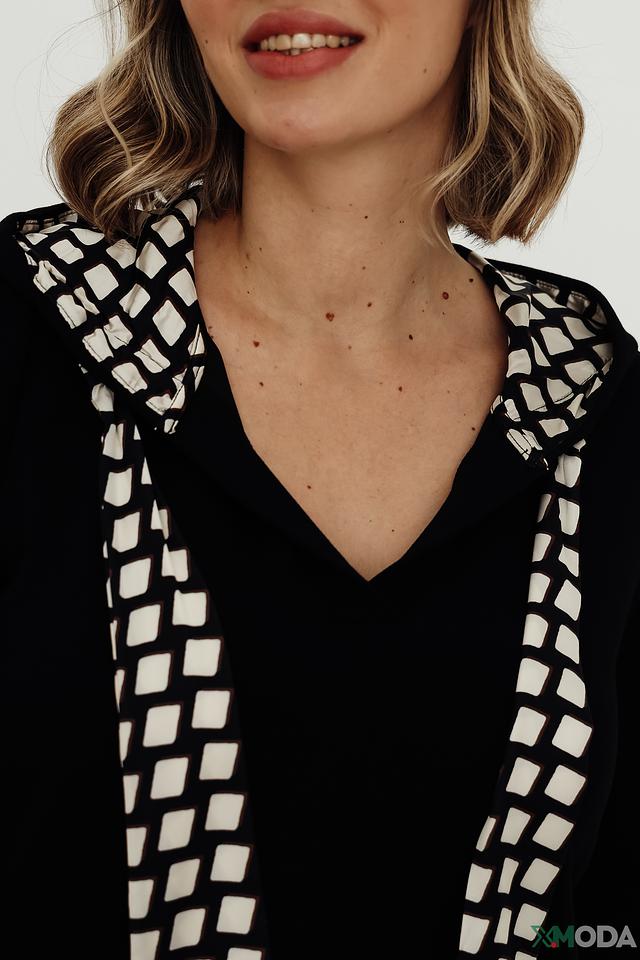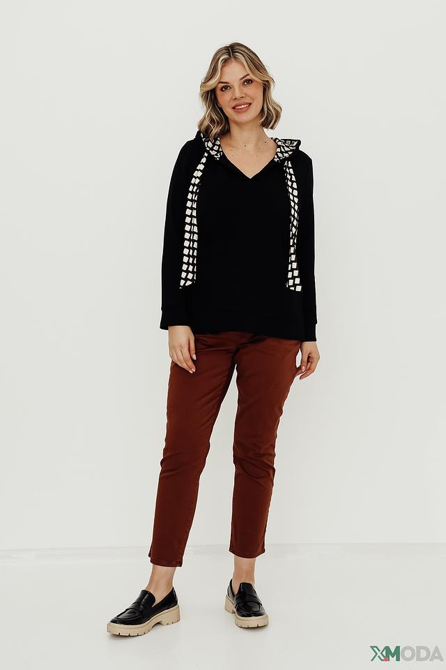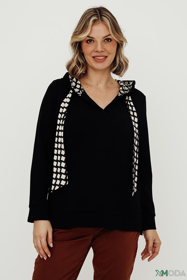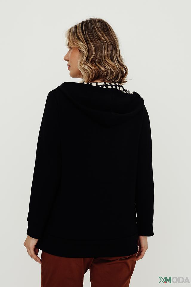 Чёрная женская толстовка Via Appia с оригинальным геометрическим принтом на капюшоне и плечах. Модель имеет V-образный вырез и удобный крой, идеально подходит для создания стильного повседневного образа. Состав: полиэстер 56%, вискоза 40%, эластан 4%