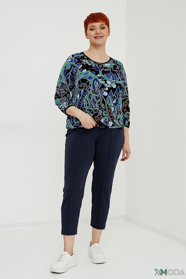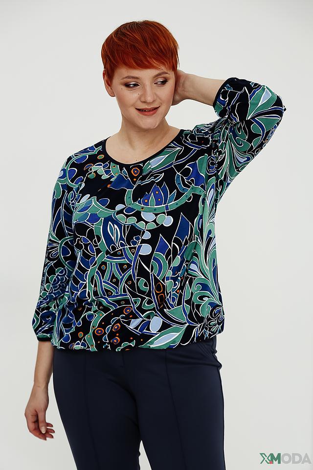 Основной цвет блузы – чёрный, а яркий принт с изображением цветов и листьев в оттенках синего и зелёного делает её особенно привлекательной. Блуза имеет округлый вырез горловины и рукава длиной три четверти, что делает её универсальной для разных случаев.