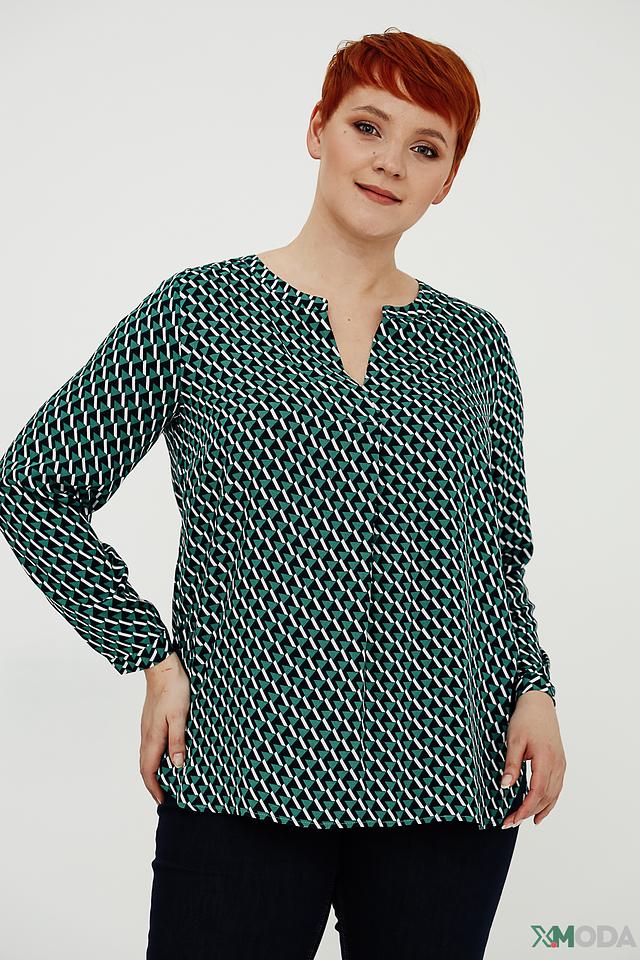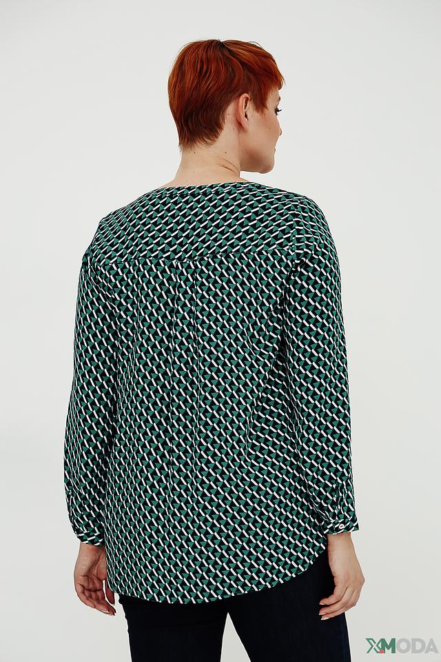 Блуза имеет яркий геометрический принт в сочетании зеленых и белых оттенков. V-образный вырез горловины и длинные рукава придают ей женственность и изящество. Свободный крой не сковывает движений и позволяет создать расслабленный силуэт.