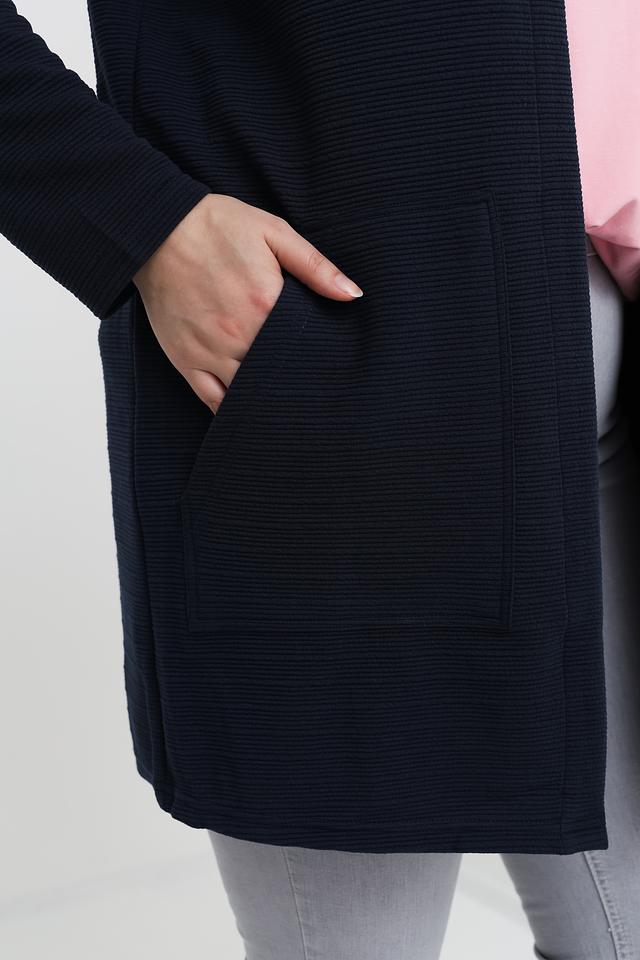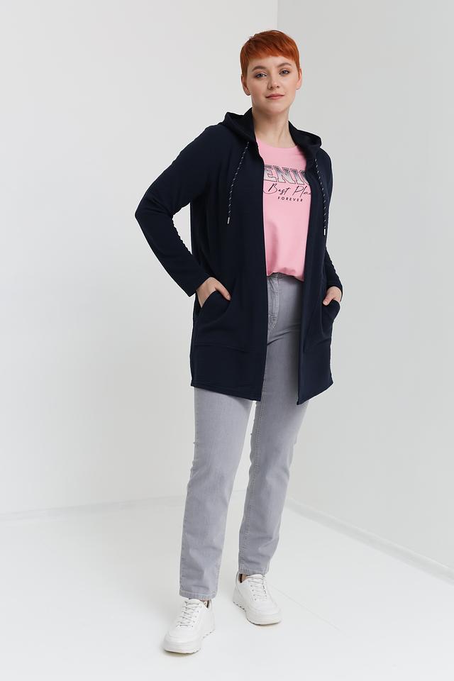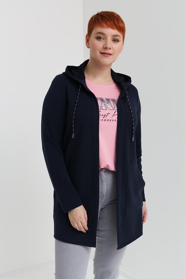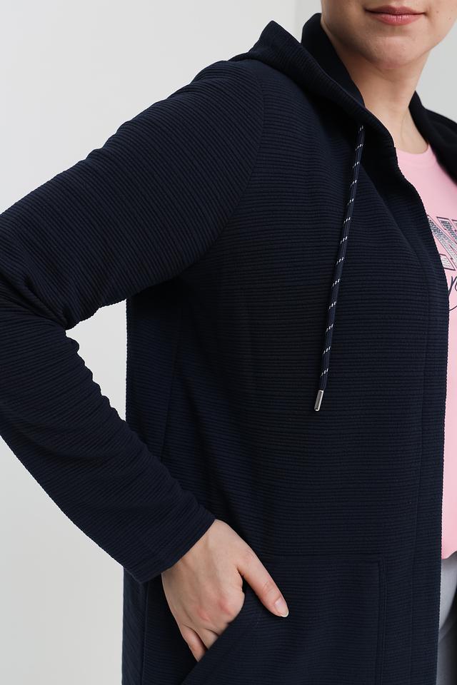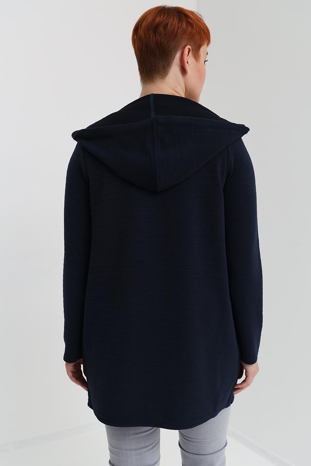 Жакет имеет удлиненный крой и свободную посадку, что обеспечивает комфорт и свободу движений. Капюшон добавляет практичности и защищает от непогоды. Фактурный трикотаж придает изделию оригинальность и визуальный интерес.