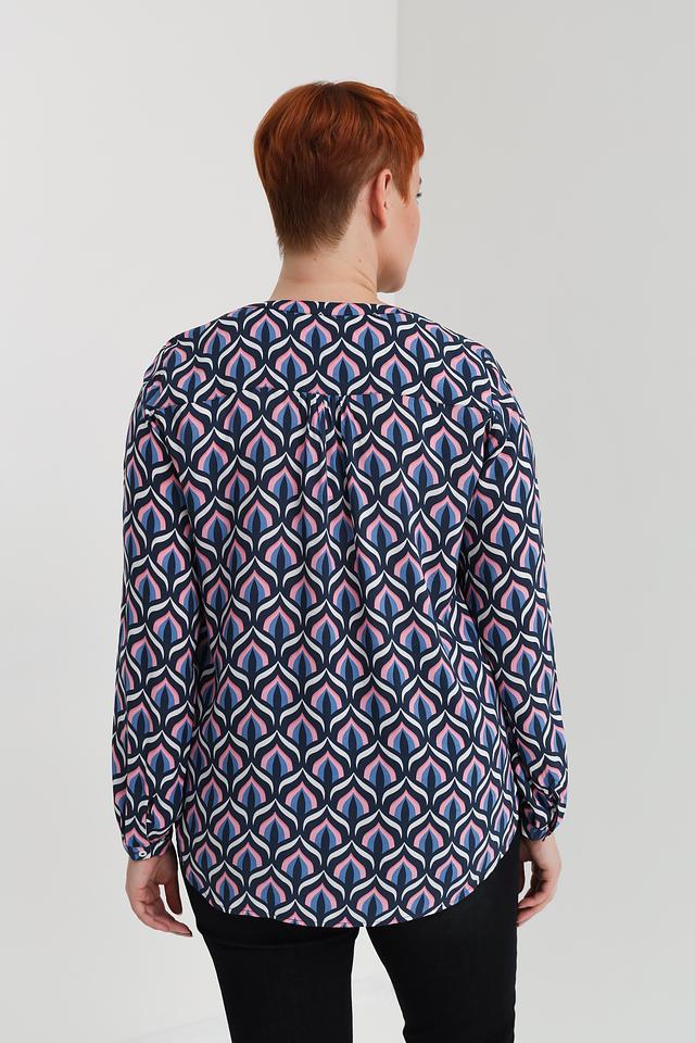 Особенностью данной блузы является яркий и необычный геометрический принт, выполненный в сочетании синего, розового и белого цветов. Этот принт делает блузу уникальной и привлекательной. Блуза идеально подойдет для повседневной носки, а также для особых случаев.