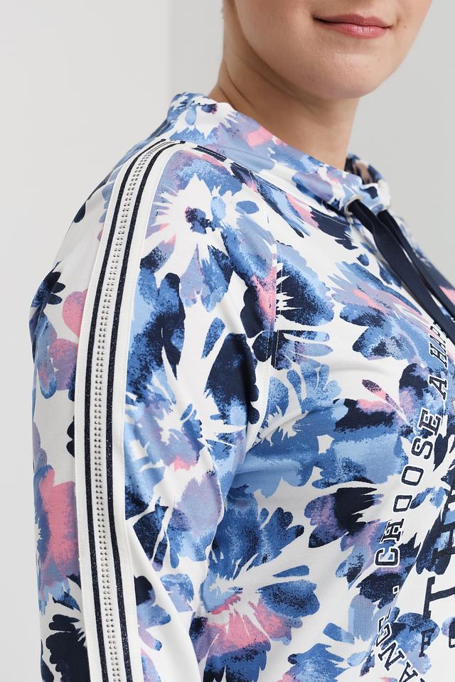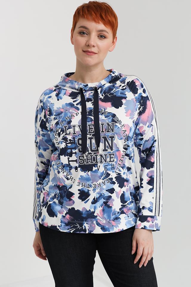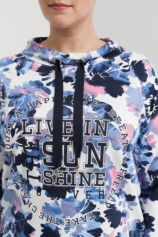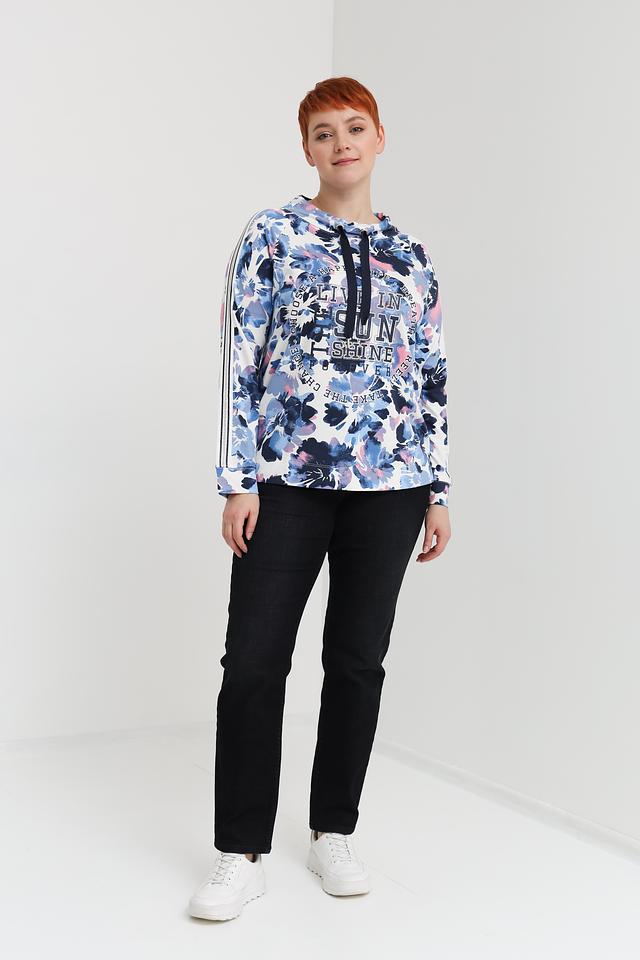 Основной цвет пуловера – нежный голубой, который служит идеальным фоном для яркого цветочного принта. Дизайн дополнен белыми полосками по рукавам, придающими образу спортивный шик. Капюшон добавляет практичности и позволяет создать более расслабленный образ.