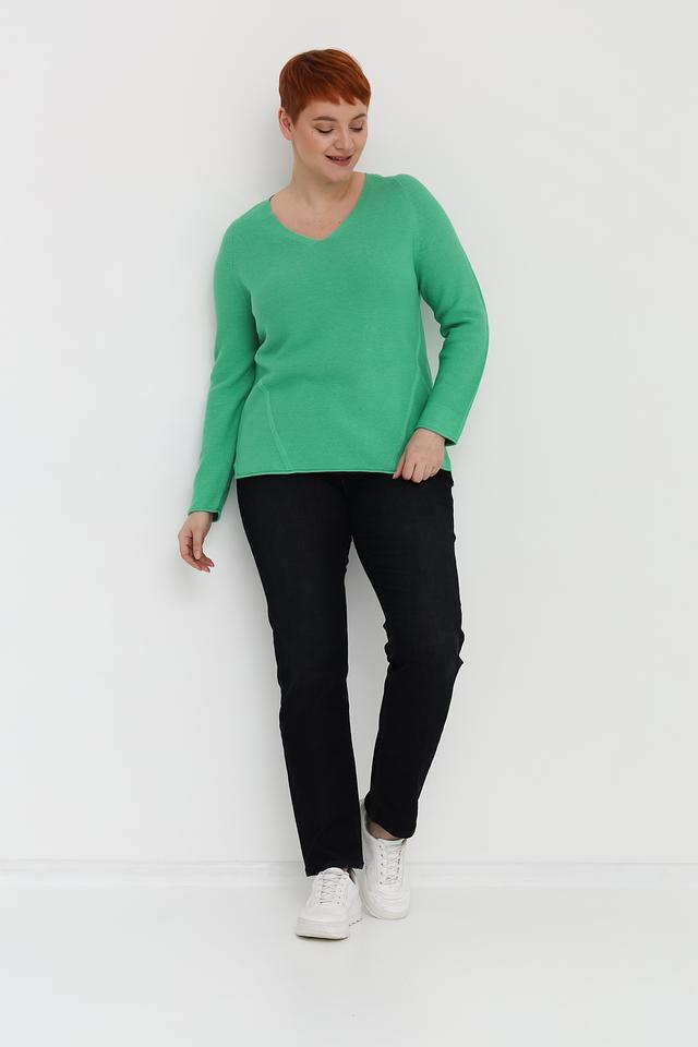 Пуловер имеет V-образный вырез горловины, который визуально удлиняет шею и делает образ более элегантным. Слегка приталенный силуэт подчёркивает фигуру, не сковывая движений. Рукава длинные, классической формы.