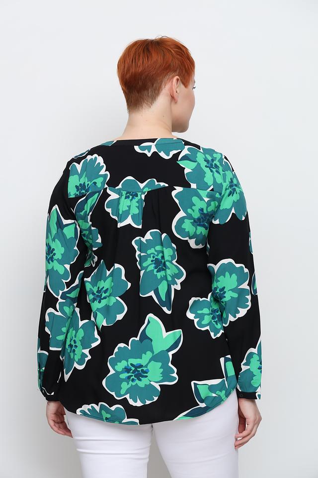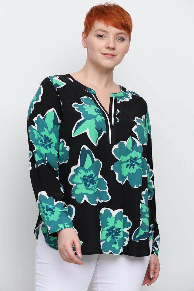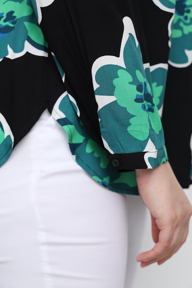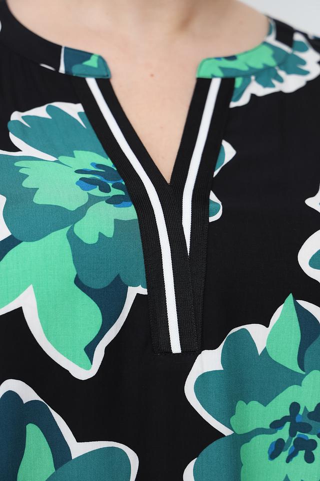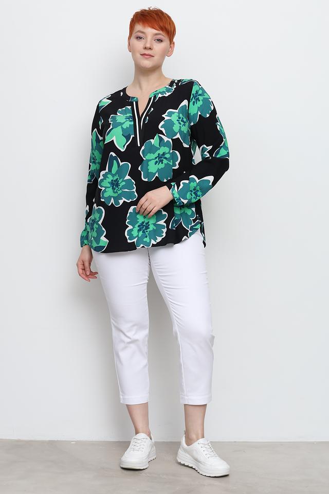 Основной цвет блузы – чёрный, который служит прекрасным фоном для крупного цветочного принта в оттенках зелёного. V-образный вырез горловины дополнен белой окантовкой, что добавляет контрастности и свежести.